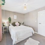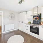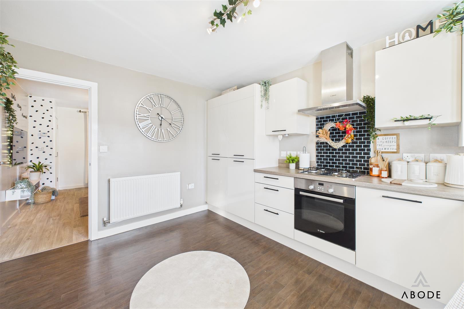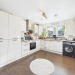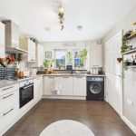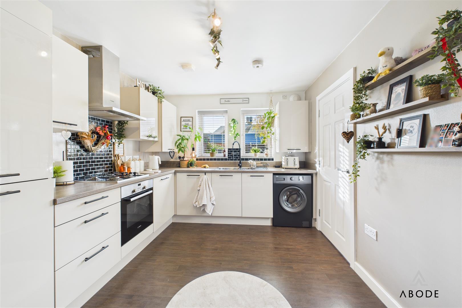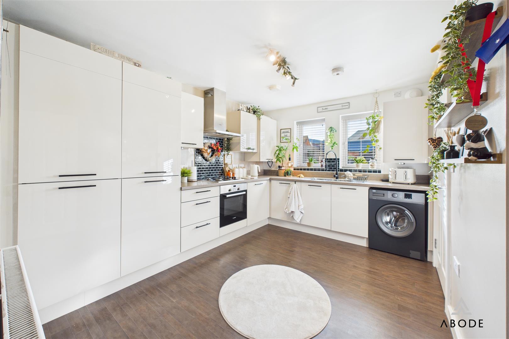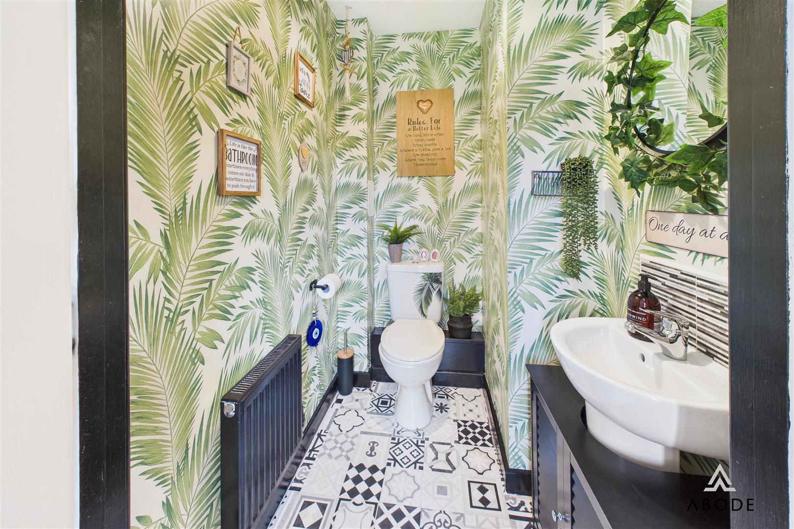 To the rear is the stylish kitchen diner, fitted with a modern selection of matching wall and base units, integrated oven and hob, tiled splash backs, space for appliances, and room for a dining table. Two windows overlook the garden, and a rear door provides direct access outside. Completing the ground floor is a guest WC, fitted with a wash-hand basin and low-level WC.