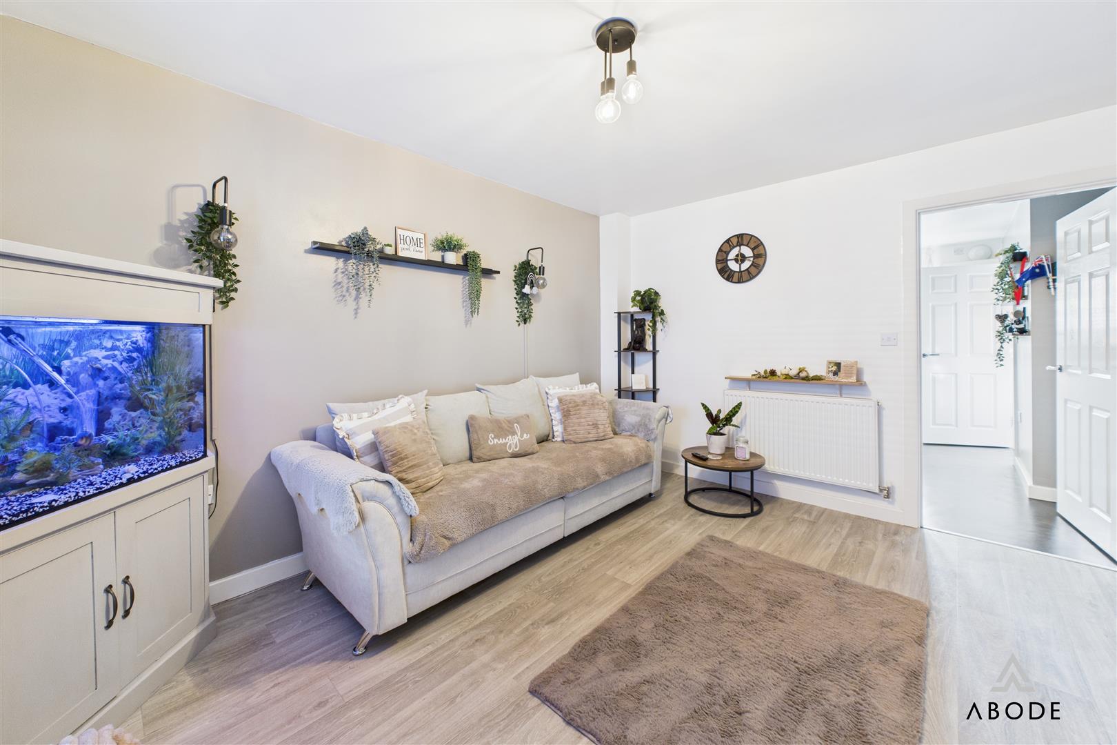 The home is approached via an entrance hallway with doors leading into the living spaces and stairs rising to the first floor. The living room is set to the front elevation and offers a bright, welcoming space with neutral décor, a feature wall, and ample room for furniture.