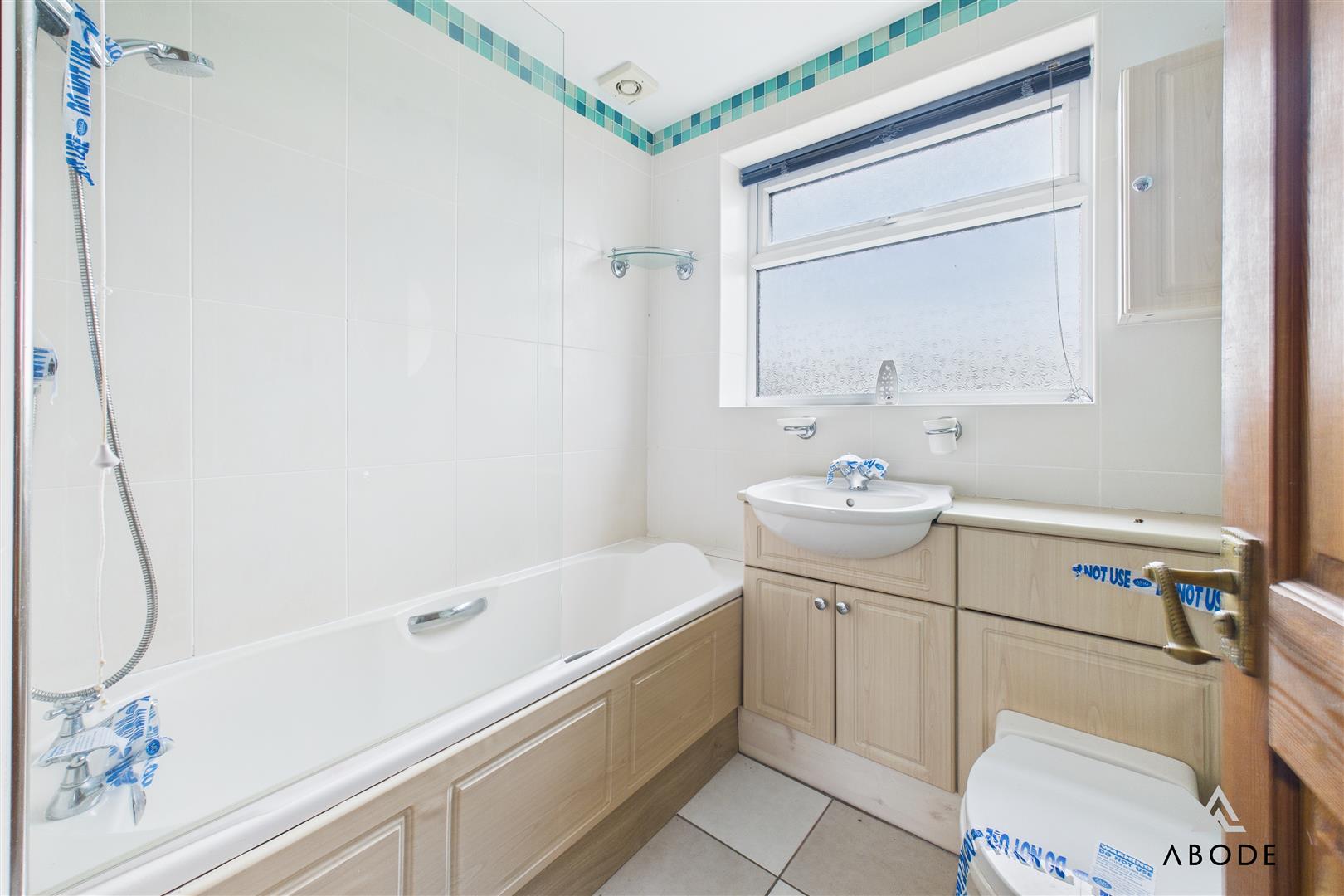 Panel enclosed bath with a shower over, vanity sink unit with wash hand basin and storage under, low flush wc, radiator and upvc double glazed window.