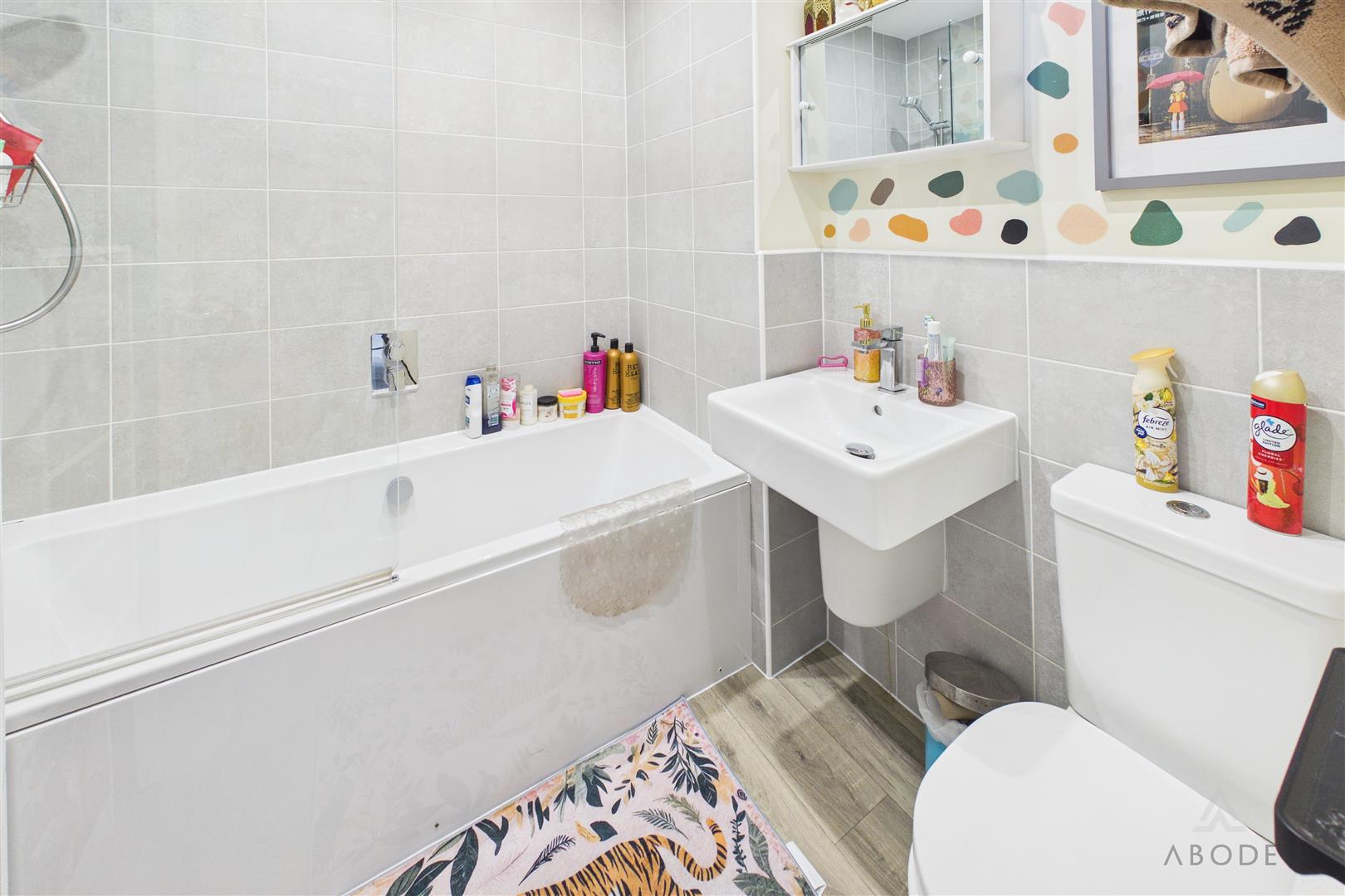 Panel enclosed bath with a shower over, wash hand basin, low flush wc and a radiator.