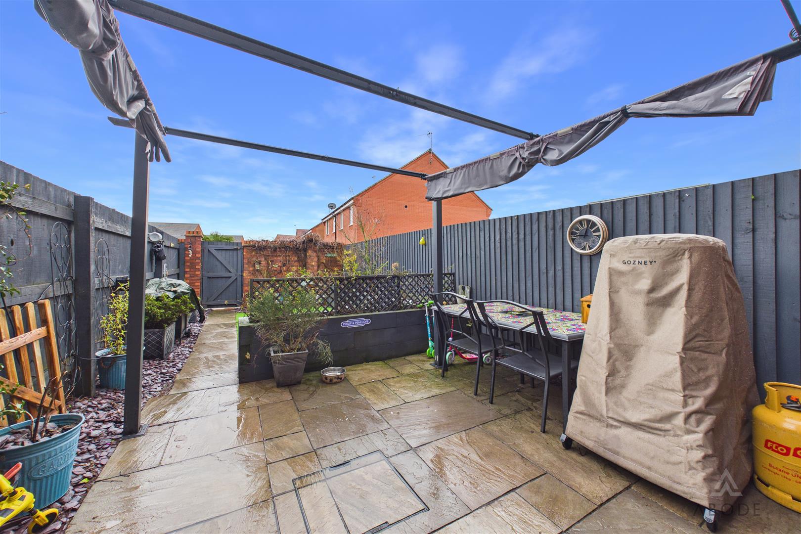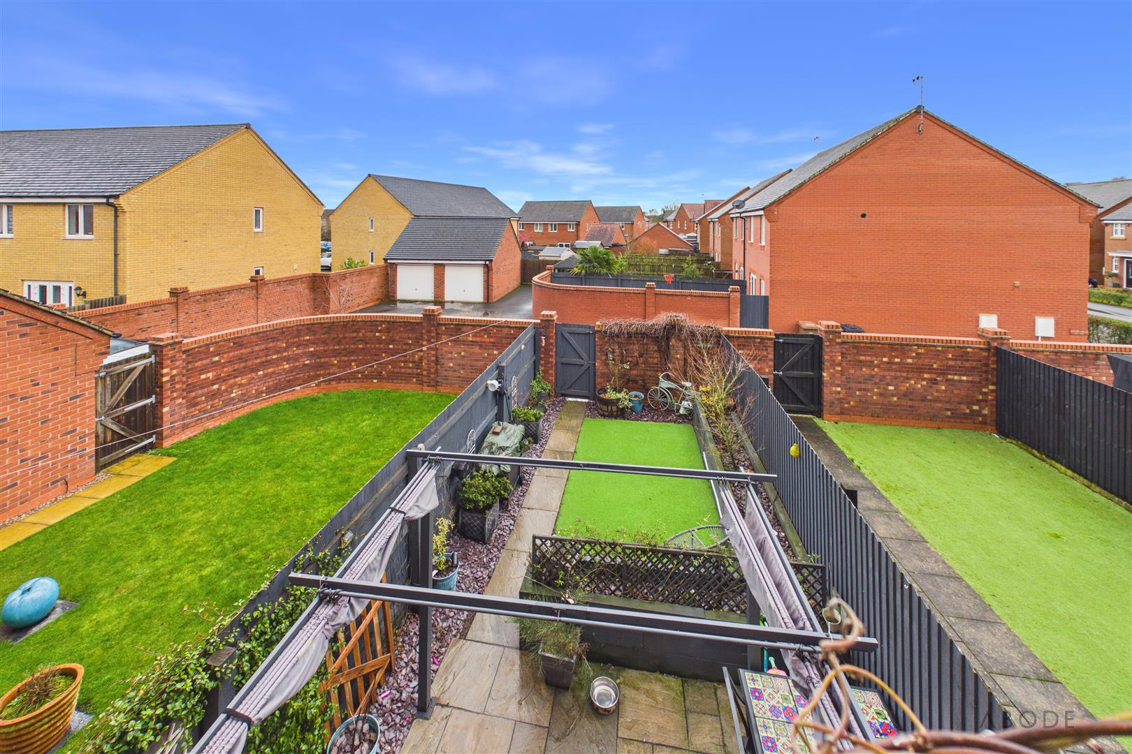 Front fore garden and EV charging point. Enclosed rear garden with paved seating area, artificial lawn, raised beds and a rear gate to the parking and a single garage with up and over door.