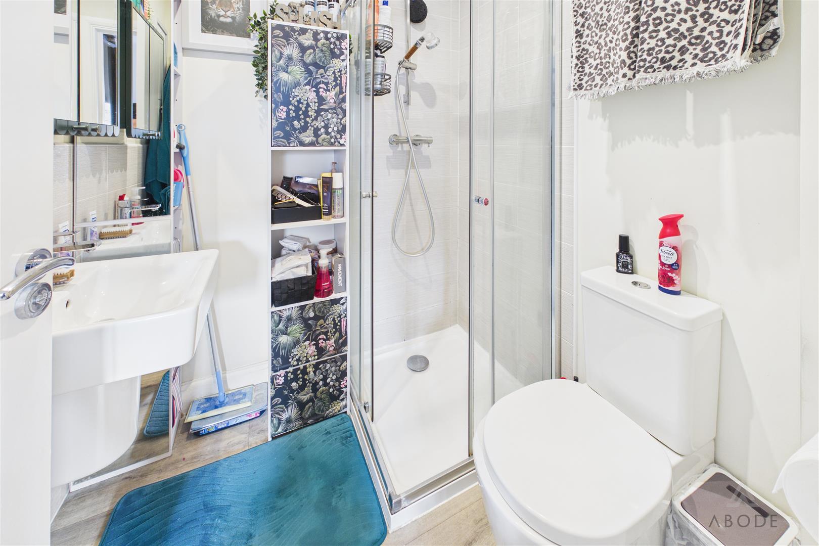 Enclosed shower, low flush wc, wash hand basin and a radiator.