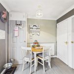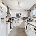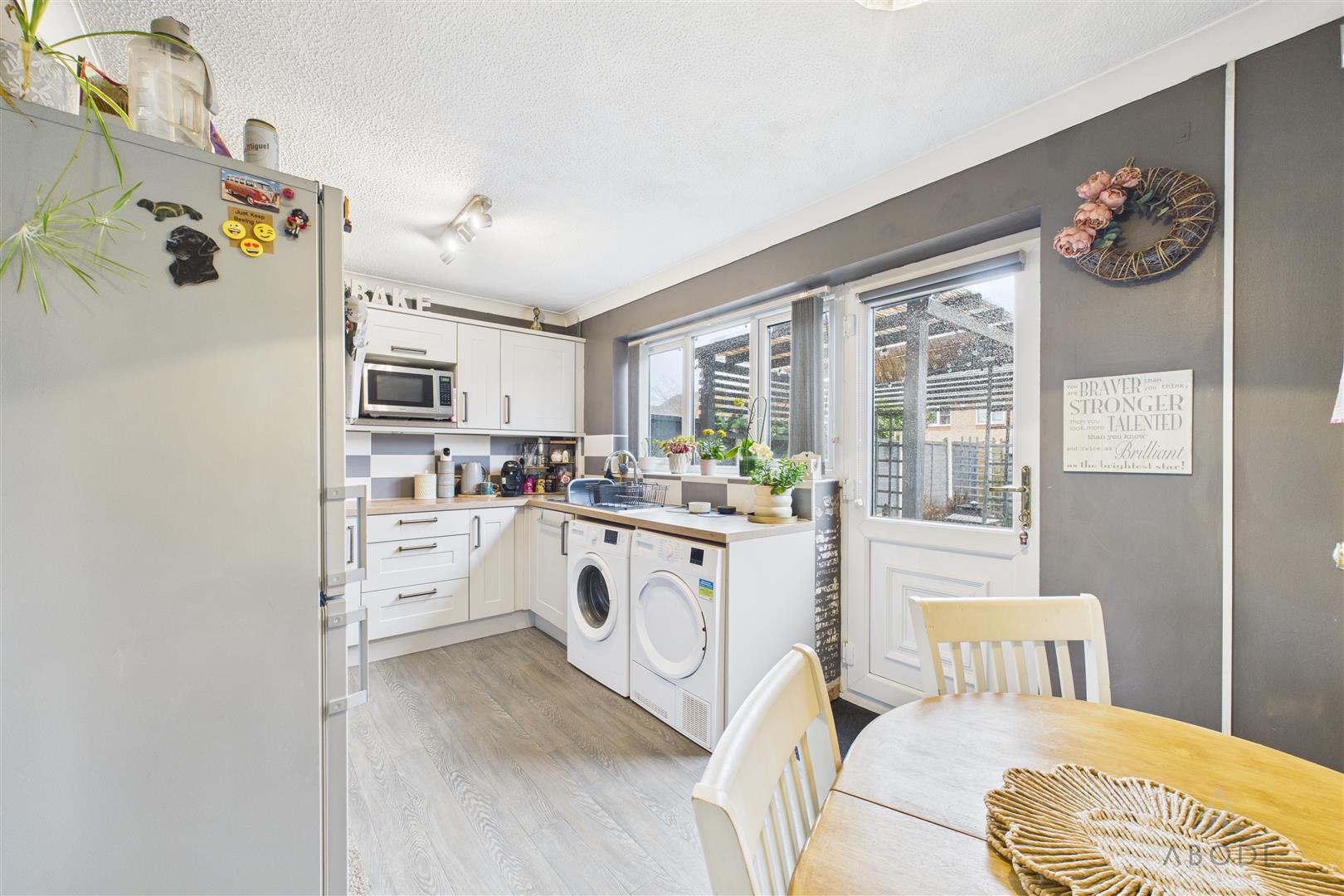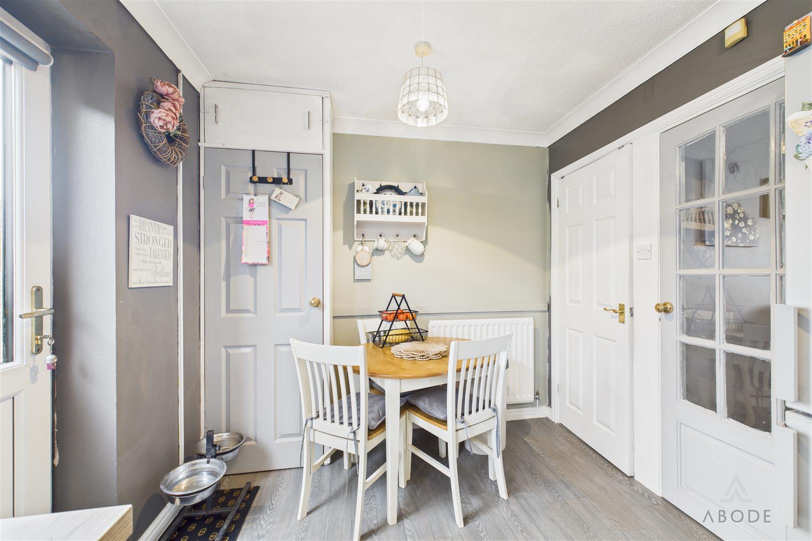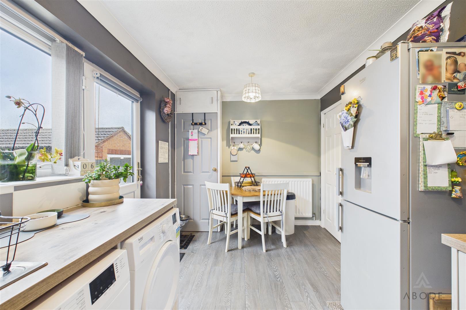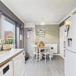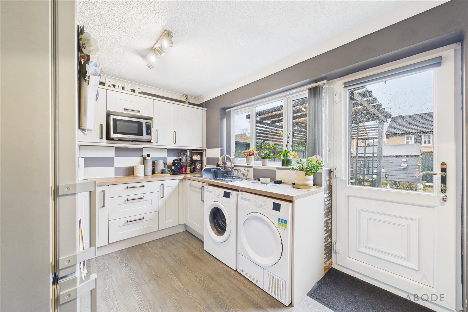 Modern base and eye level units with complimentary worktops, sink with draining board, integrated cooker and hob with extractor hood above. Space and plumbing for a washing machine, fridge freezer, tumble dryer and microwave, UPVC double glazed window to the rear elevation and door leading out into the garden. Pantry cupboard, central heating radiator and ample space for a dining table and chairs.