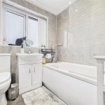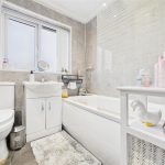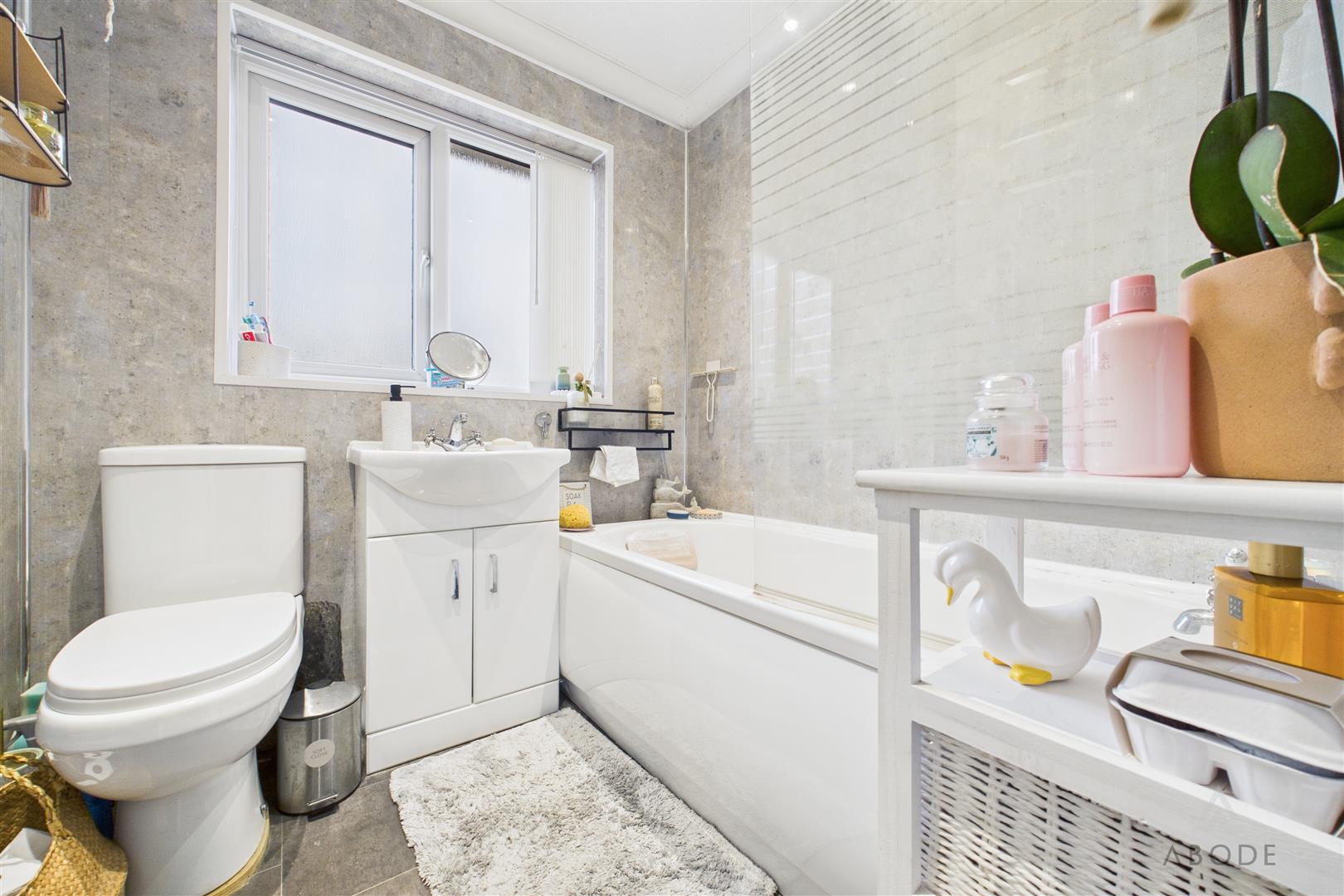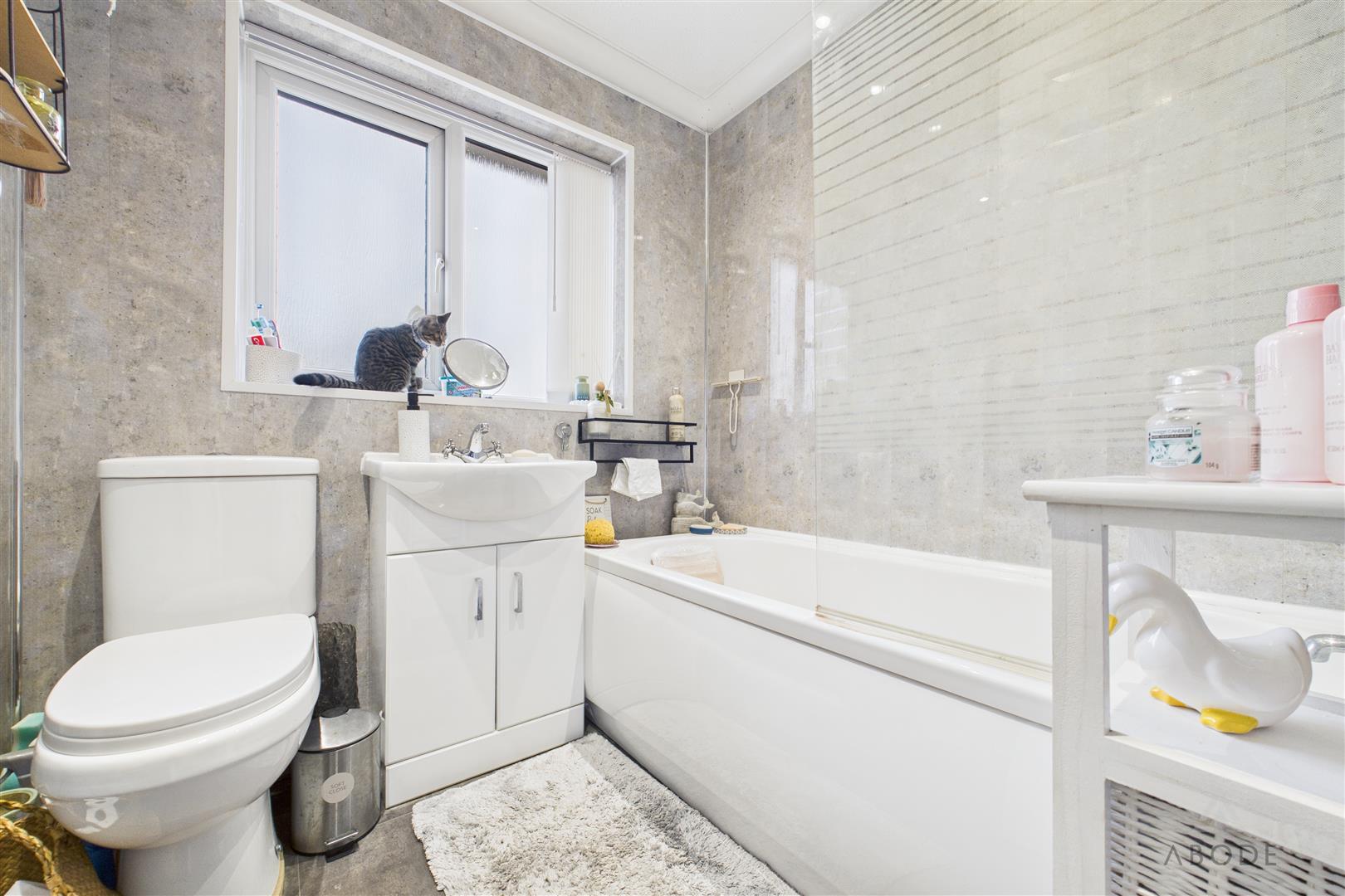 Modern white suite comprising;- WC, wash hand basin and bath with shower over and glass shower screen. UPVC double glazed window to the rear elevation, towel radiator and spot lighting.