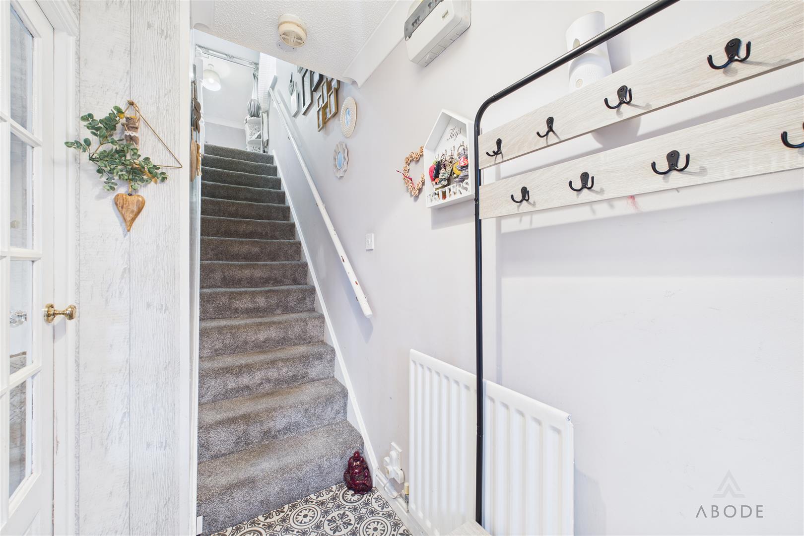 Door leading in from the front, central heating radiator and stairs leading to the first floor.