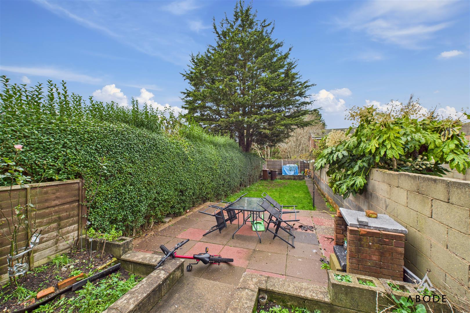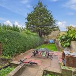 The rear garden is a good size and features a patio area ideal for outdoor seating, steps up to a lawned section, and fenced boundaries.
