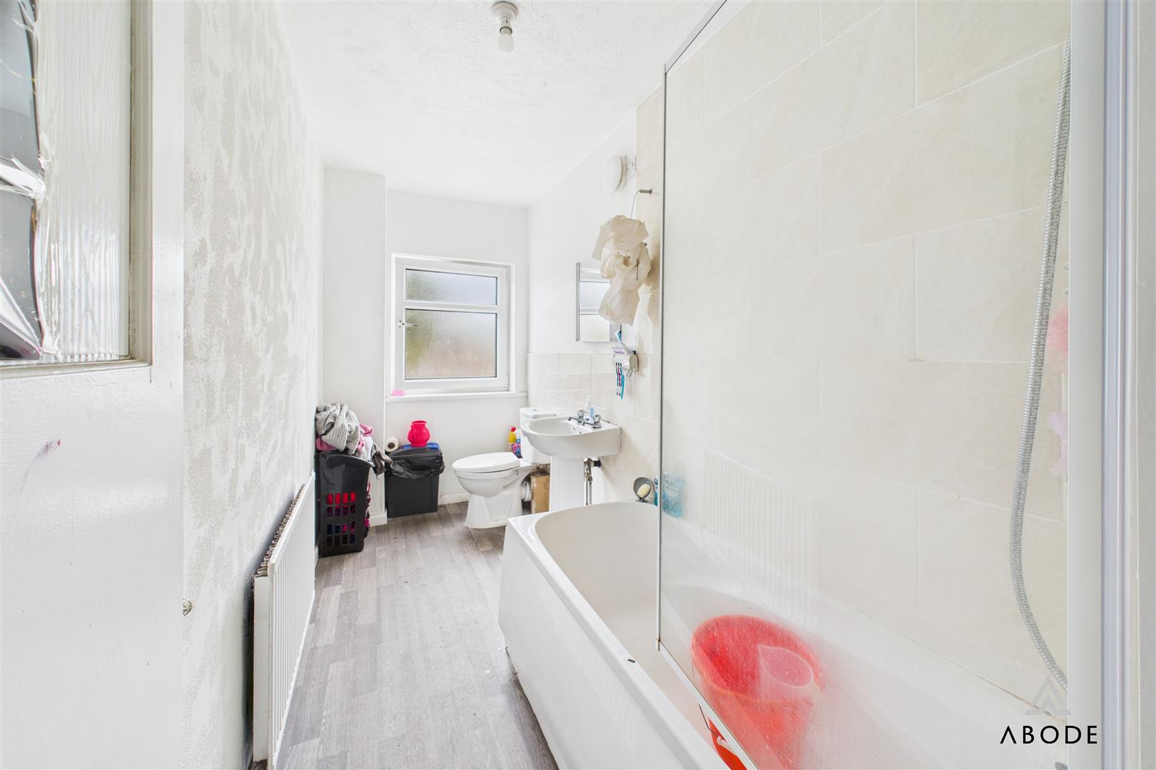 The bathroom is fitted with a three-piece suite comprising a bath with shower over, wash-hand basin, and WC, with a window to the rear elevation.