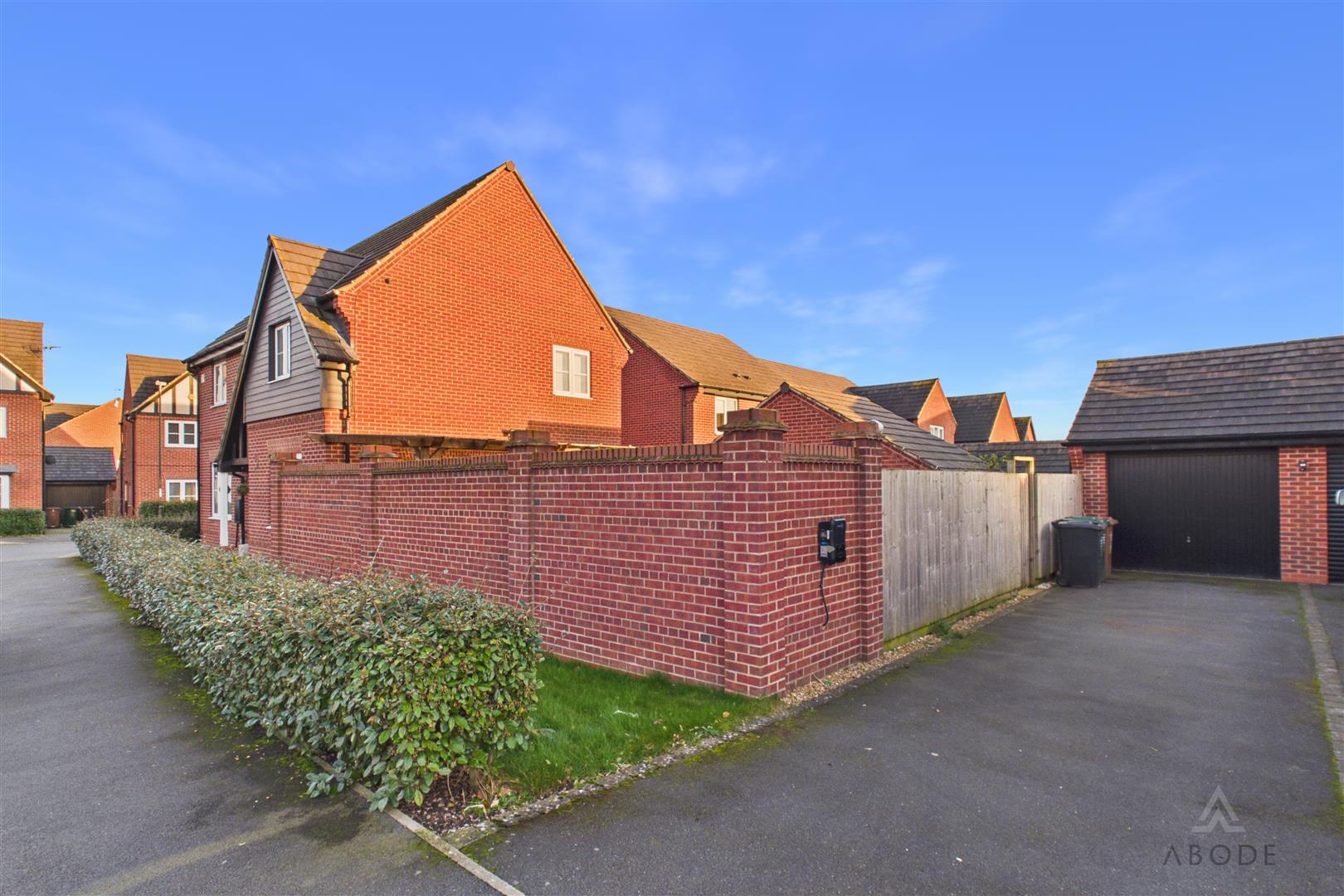 Occupying a prominent corner position, the property enjoys a neatly maintained frontage bordered by hedging. To the side, a driveway provides off-road parking and leads to a detached garage.