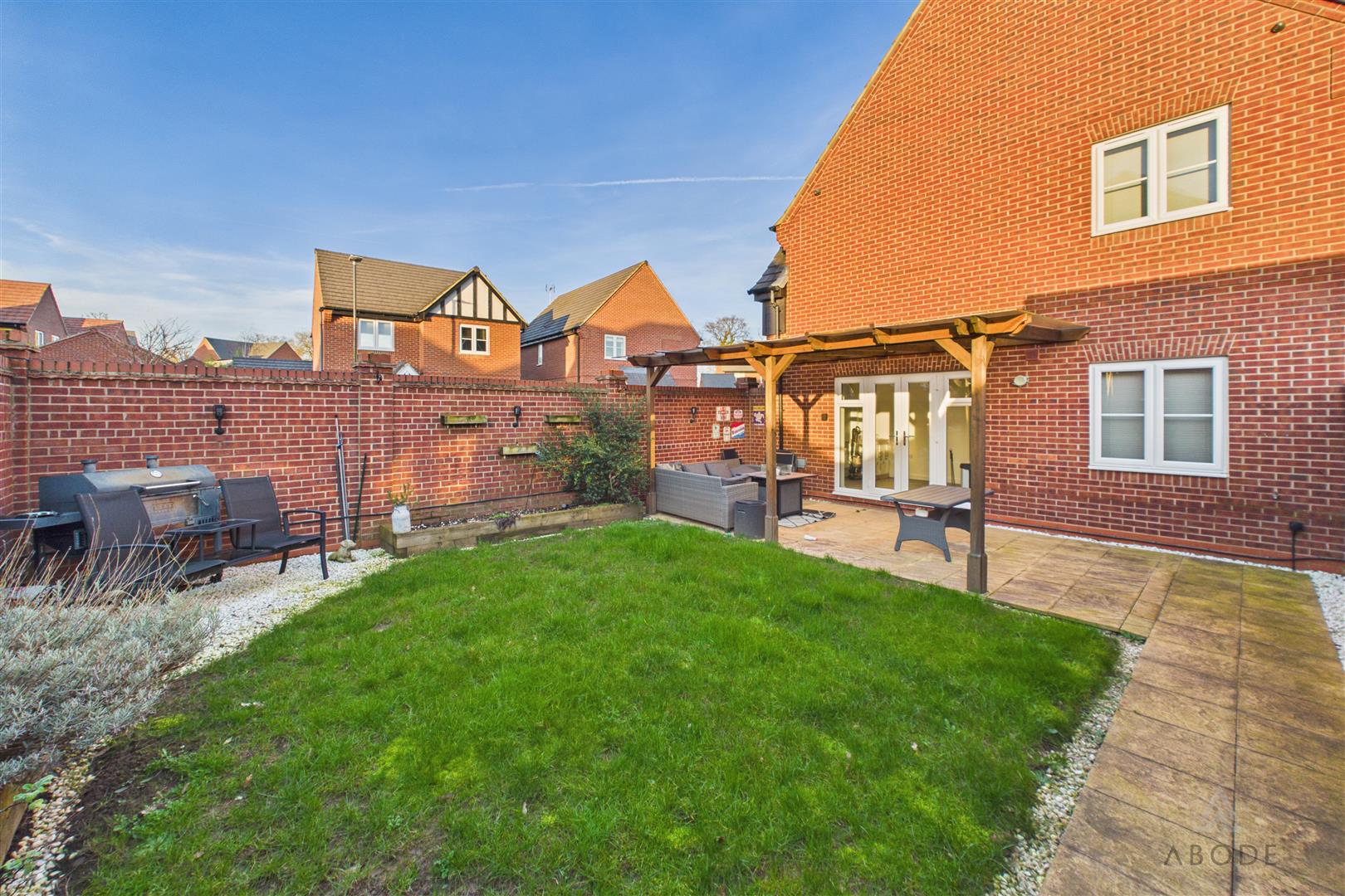 The rear garden is enclosed by attractive brick walling, offering a good degree of privacy. Laid mainly to lawn, it also benefits from a generous patio area and a covered pergola seating space, ideal for outdoor dining and entertaining throughout the warmer months.