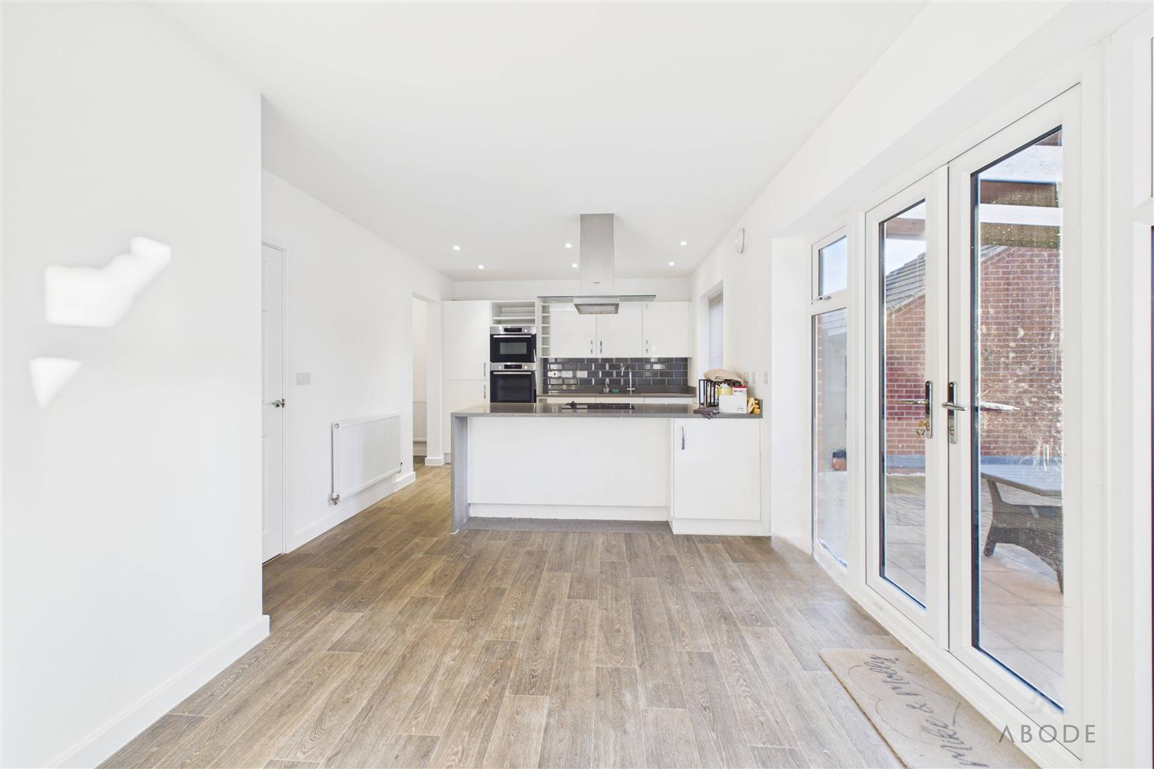 To the right of the hallway lies the impressive open-plan kitchen diner, undoubtedly the heart of the home. Fitted with a range of modern wall and base units and complemented by ample work surface space, the kitchen features a central island with integrated hob and extractor over, along with integrated appliances. There is generous space for both dining and additional seating, creating a versatile and sociable layout. French doors open directly onto the rear garden, seamlessly blending indoor and outdoor living.