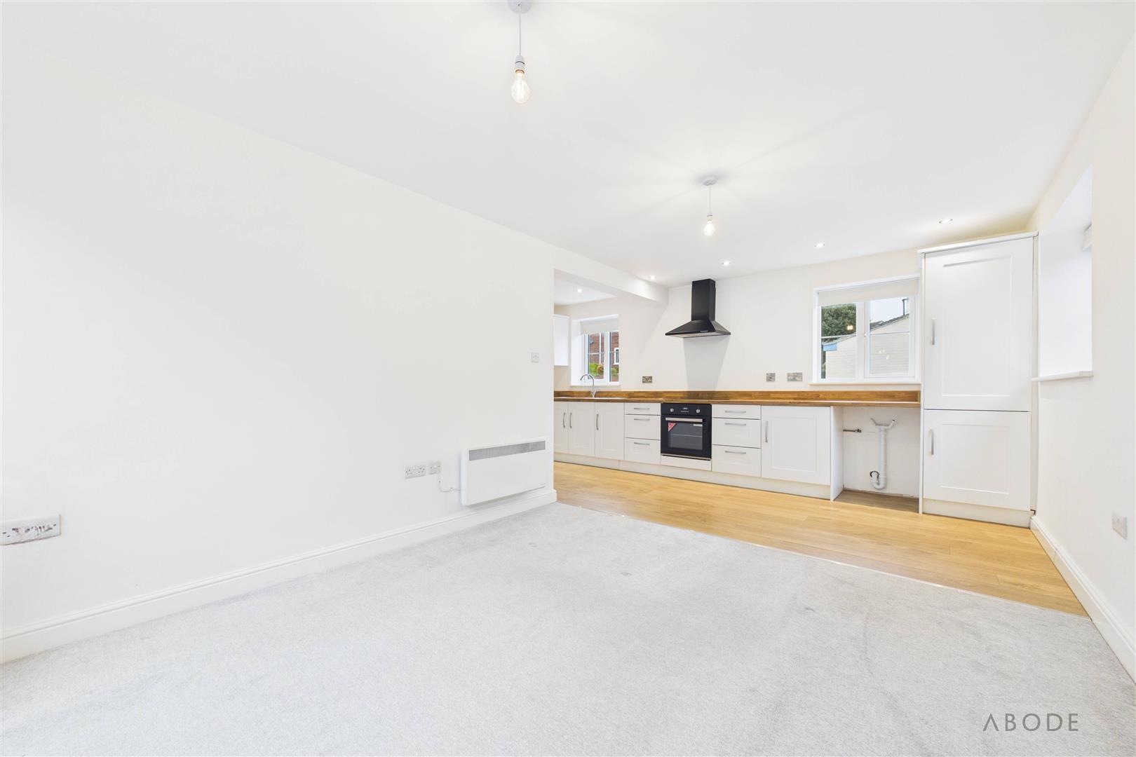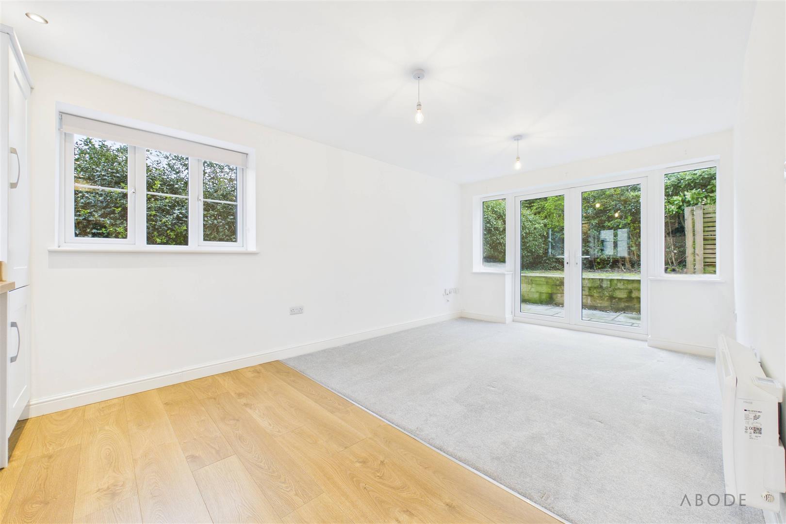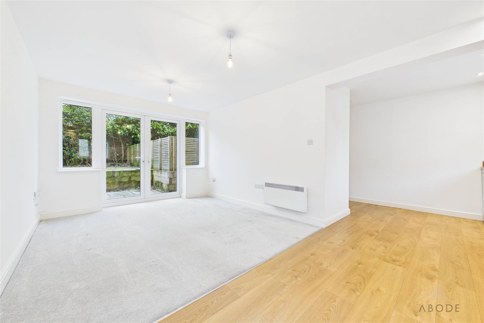 A bright and welcoming open-plan space with UPVC double glazed French doors opening onto the rear garden, complemented by additional windows allowing for ample natural light, and an electric storage heater and master telephone socket.
