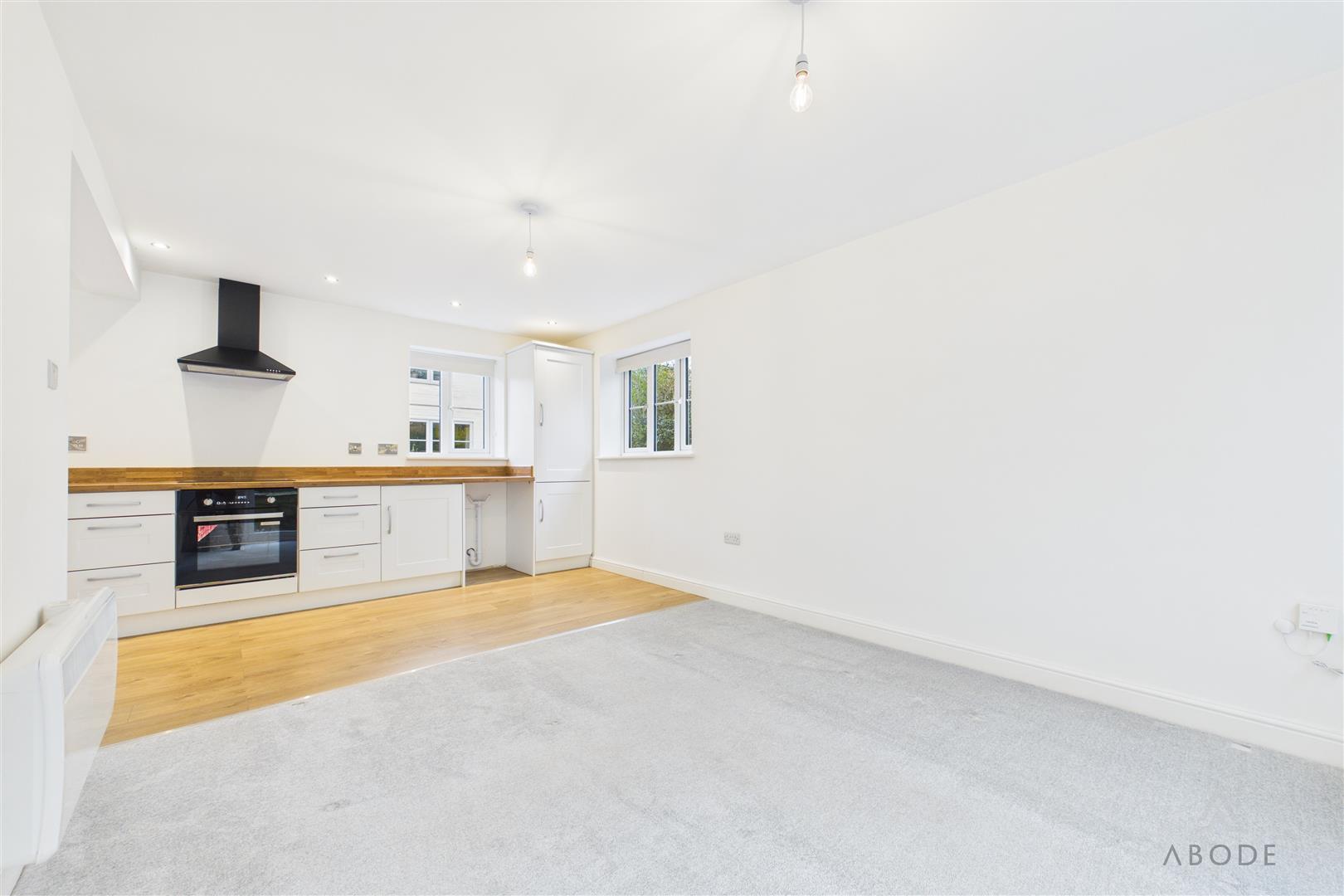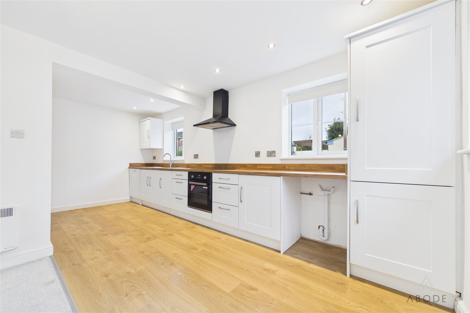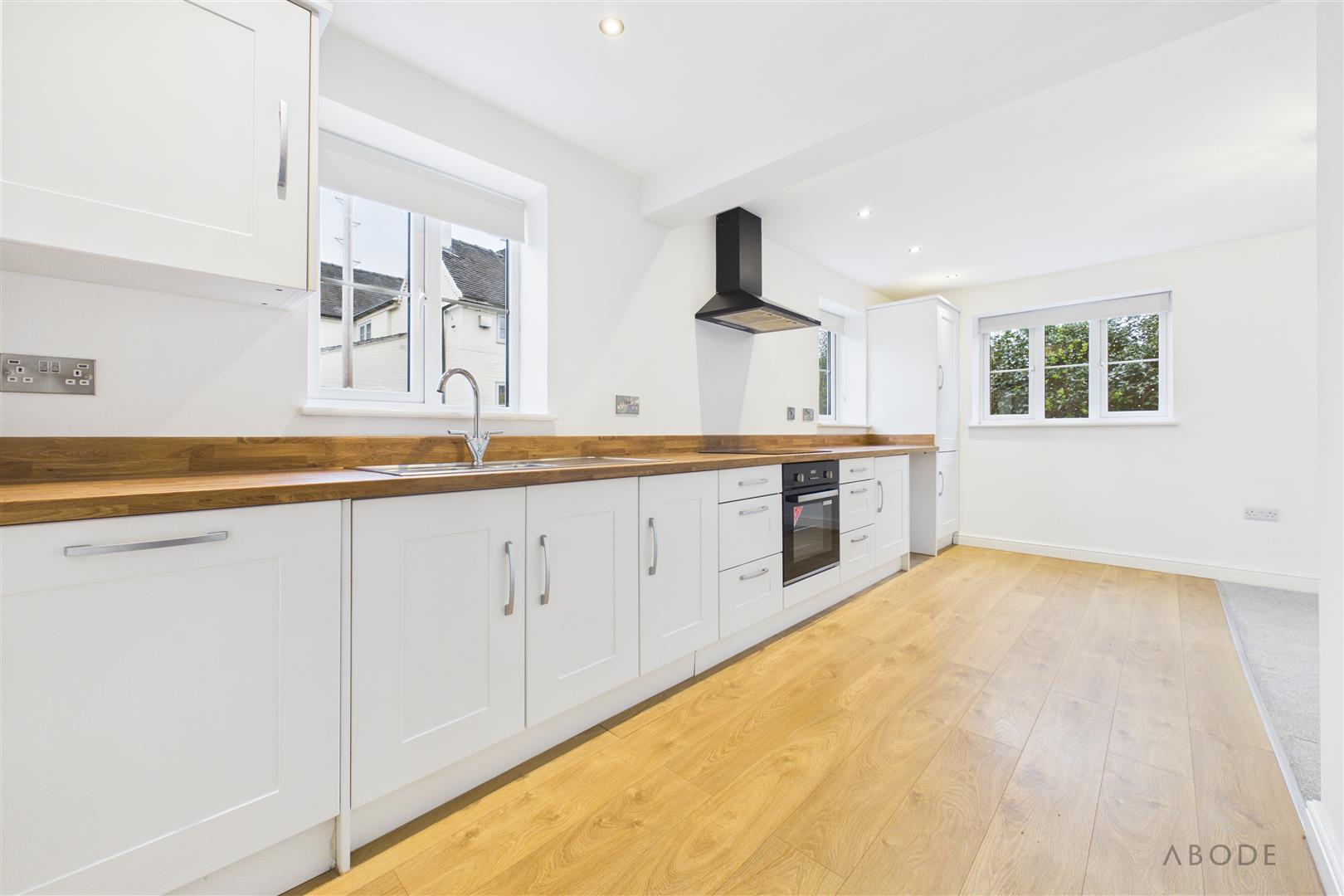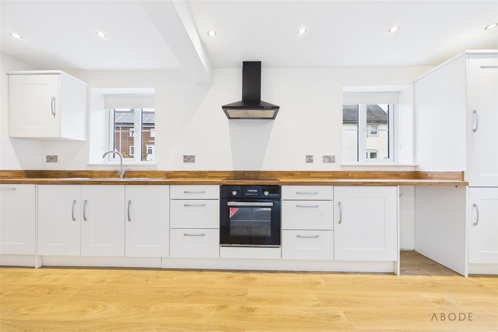Fitted with a range of matching wall and base units with wood block effect work surfaces, incorporating integrated appliances including fridge, freezer, dishwasher, stainless steel sink with mixer tap, induction hob and oven/grill, with windows to the front and side elevations providing a pleasant outlook.