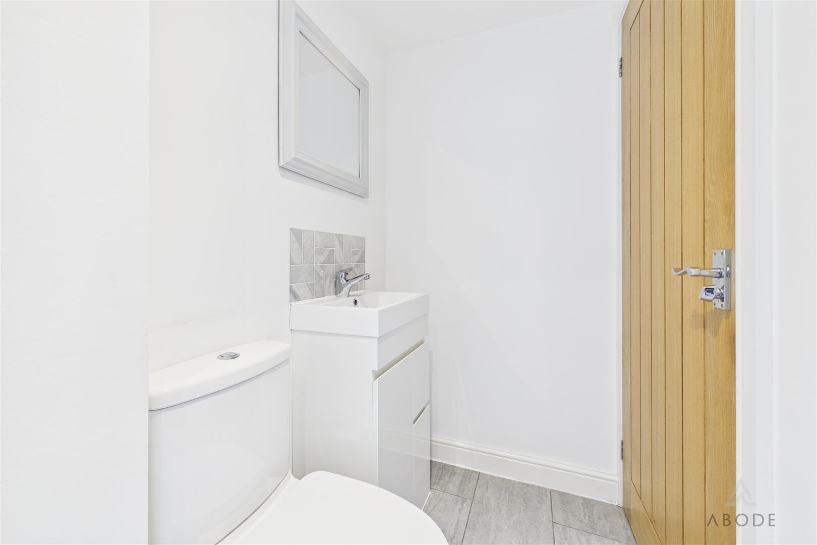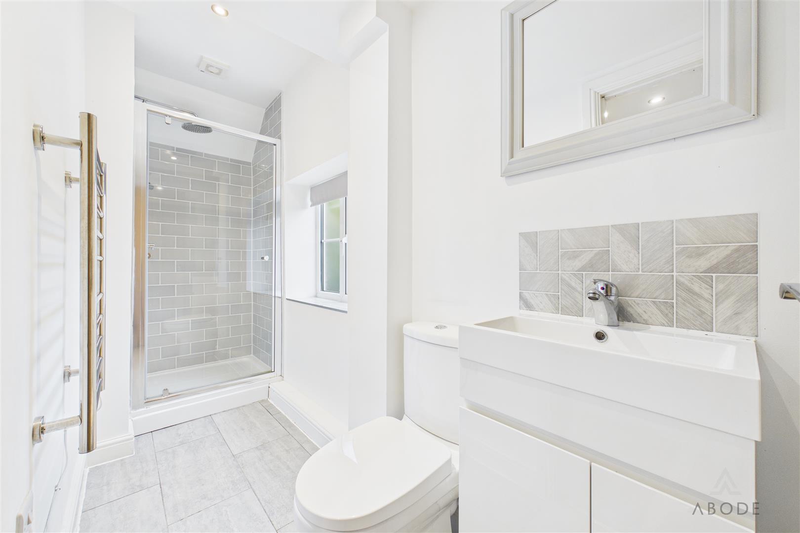 Fitted with a contemporary three-piece suite comprising low-level WC, vanity wash hand basin and shower cubicle with waterfall showerhead, complemented by tiling, heated towel radiator, extractor fan and a frosted window to the side.