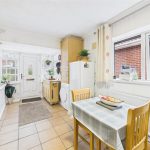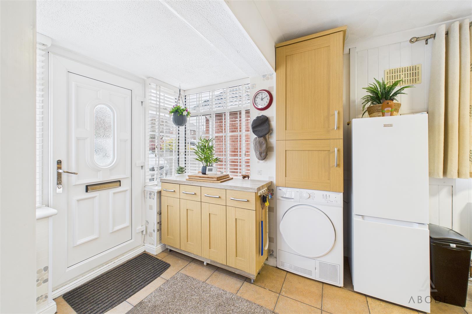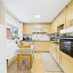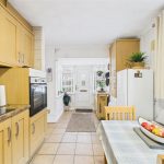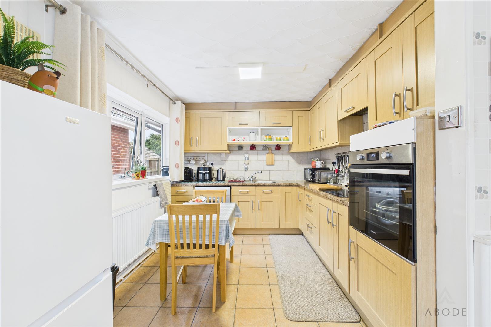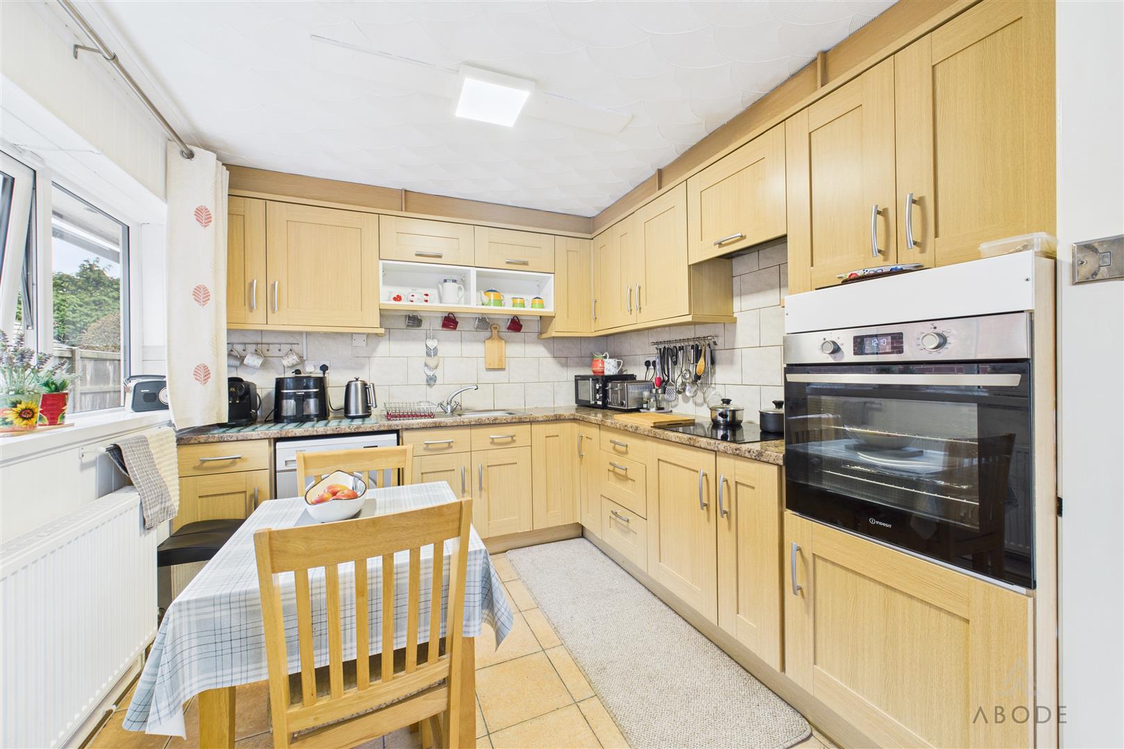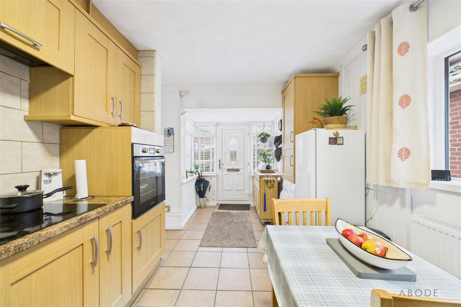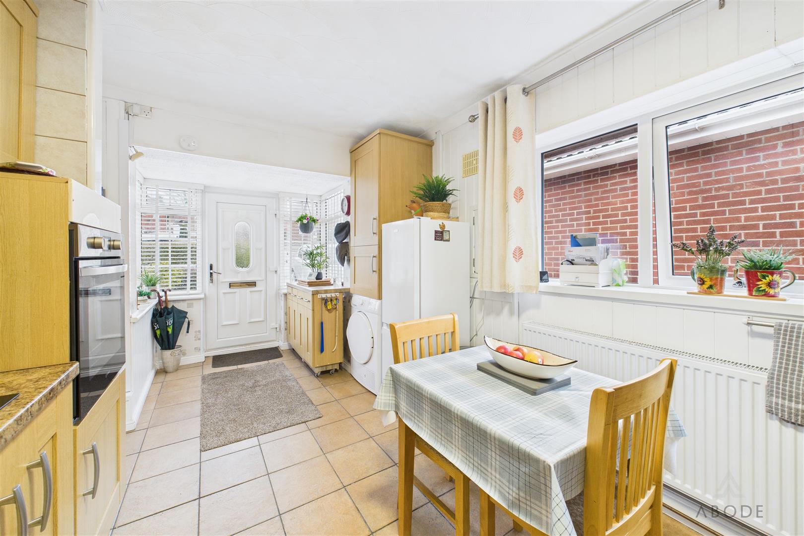 Base and eye level units with complimentary worktops, stainless steel sink with draining board, integrated cooker, hob and extractor hood above. Tiled flooring and partially tiled walls, central heating radiator, UPVC double glazed windows to the side and front elevations and door leading in from the front. Space and plumbing for a washing machine, fridge freezer and tumble dryer, ample space for a dining table and chairs.