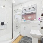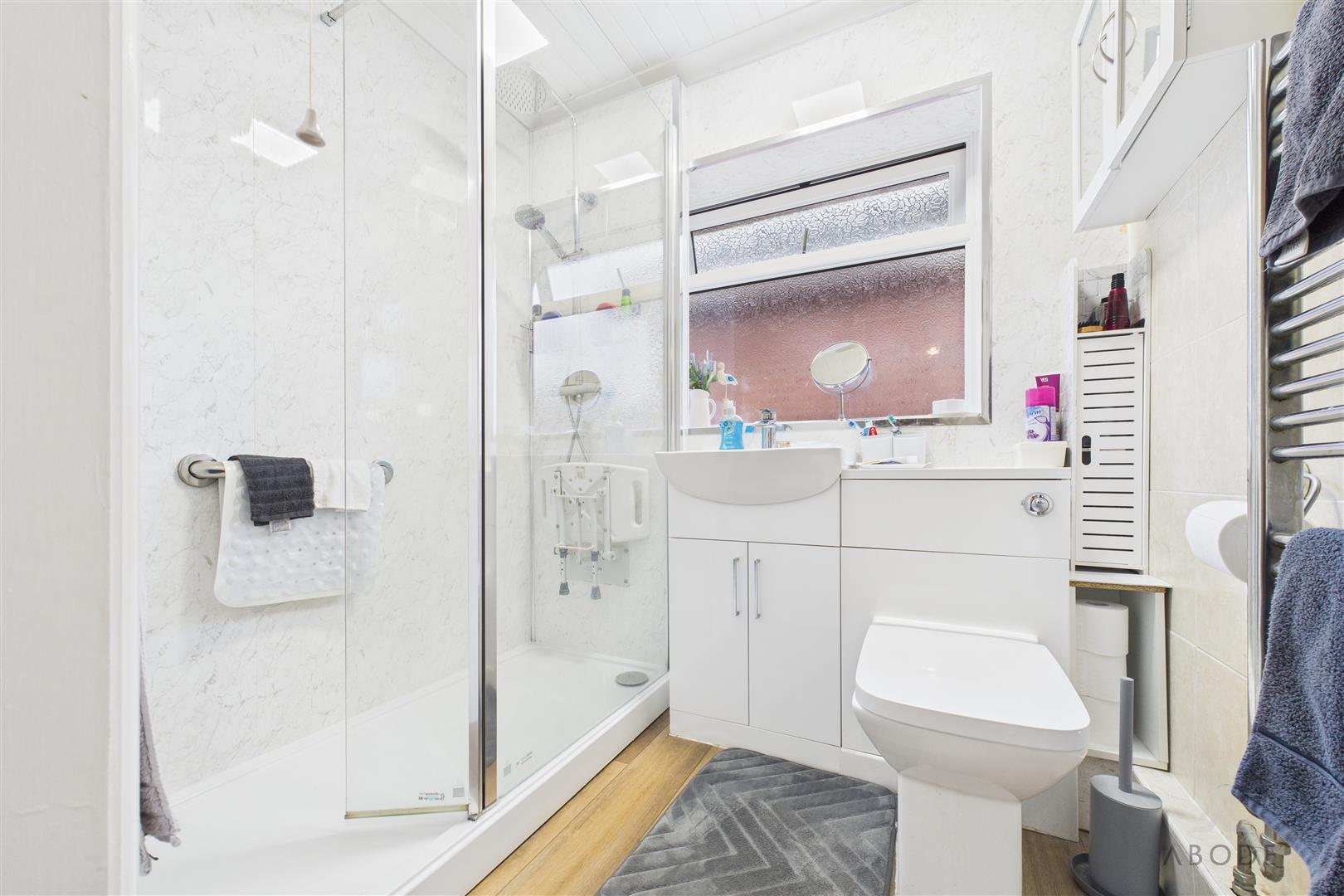 White suite comprising;- WC, wash hand basin with storage cupboard below and double shower cubicle with waterfall and hand held shower and glass shower screen. UPVC double glazed window to the side elevation, loft access, partially tiled walls, towel radiator and eye level storage cupboard.