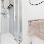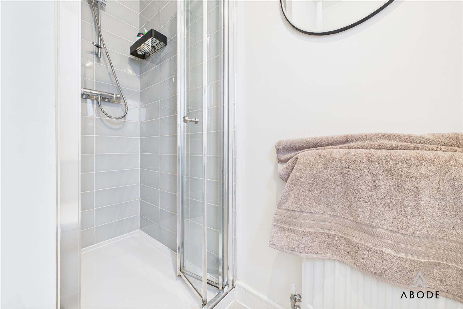 The landing serves three bedrooms and the bathroom. Bedroom 1 is a double with a rear-facing window and an en-suite comprising a tiled shower cubicle, wash-hand basin and WC, plus an opaque rear window. Bedroom 2 is a further double to the front, and Bedroom 3 is a well-proportioned single