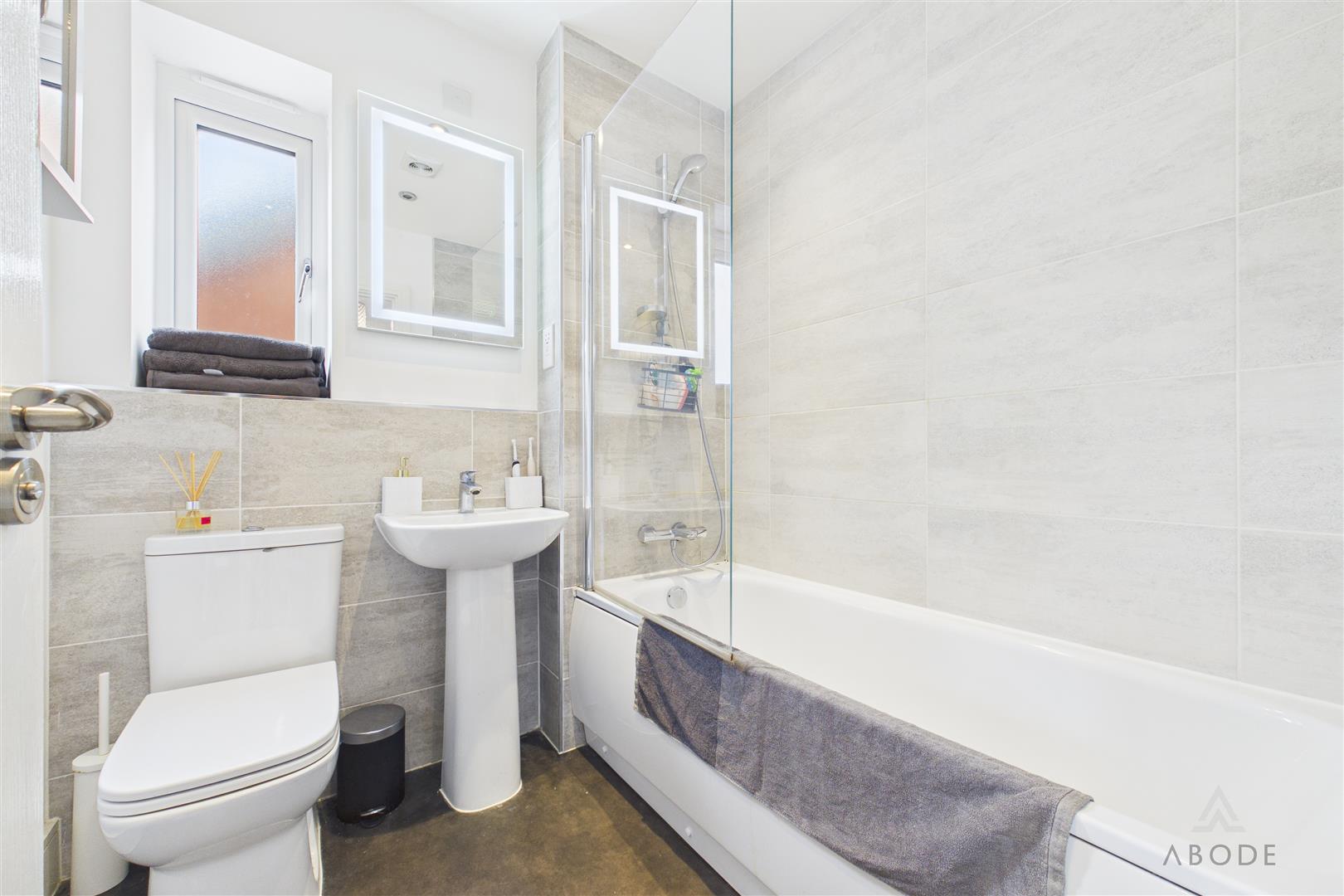 With a UPVC double glazed frosted window to the side elevation, fitted with a three-piece suite comprising a low-level WC with continental flush, pedestal wash hand basin with mixer tap, and bath with glass shower screen and shower over. Complementary tiling to the walls, heated towel radiator, ceiling spotlights, and extractor fan.
