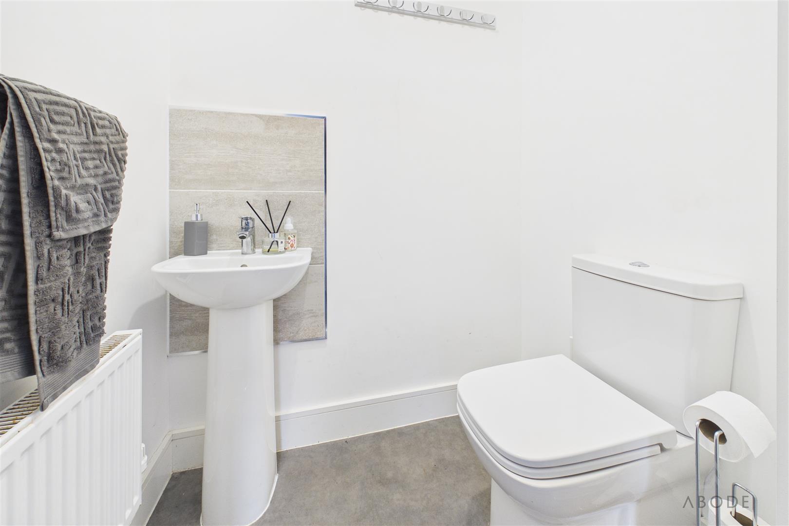 Fitted with a low-level WC with continental flush, pedestal wash hand basin with mixer tap and tiled splashback, heated towel radiator, and extractor fan.