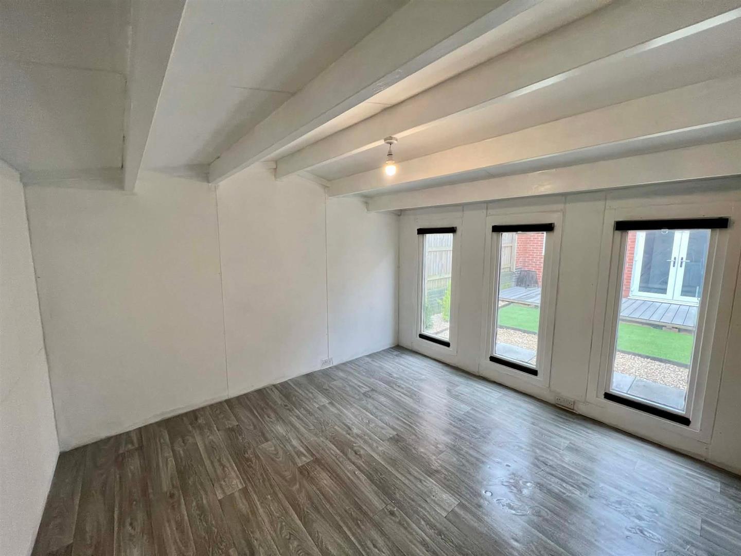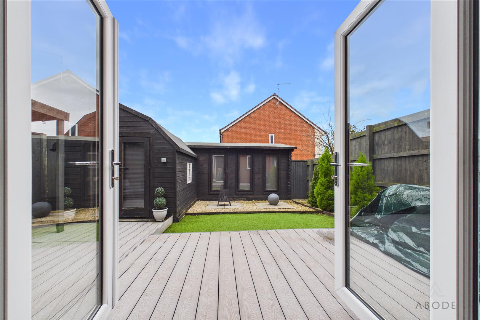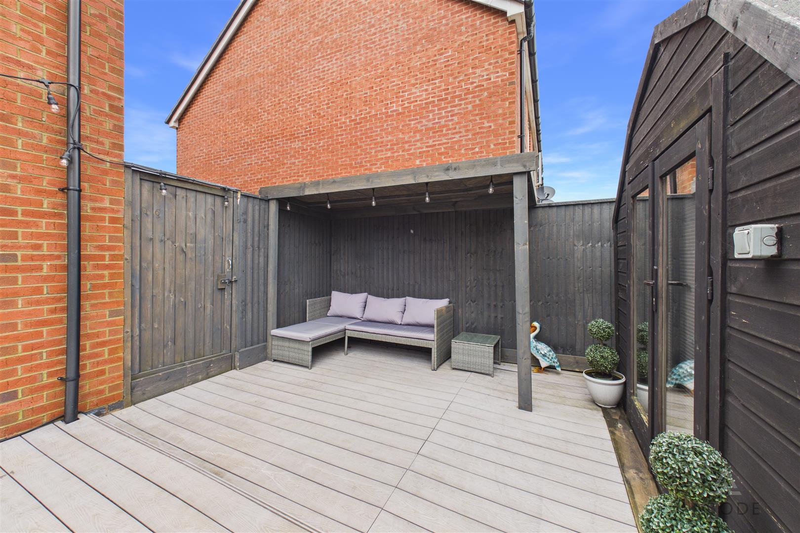 To the side elevation there is gated access leading to an area housing a useful garden storage shed, with a further gate providing access to the rear garden. The rear garden features composite decking, ideal for entertaining, with a pergola canopy creating a pleasant seating area. Beyond this is a garden laid partly to artificial lawn, with the remainder finished in gravel, complemented by two feature stone-based patio areas and decorative shrubbery borders. A particular highlight is the large, purpose-built L-shaped garden storage shed offering a variety of potential uses, featuring double doors to the front elevation, electric power supply, and three double glazed windows to the front.