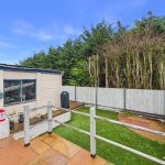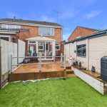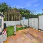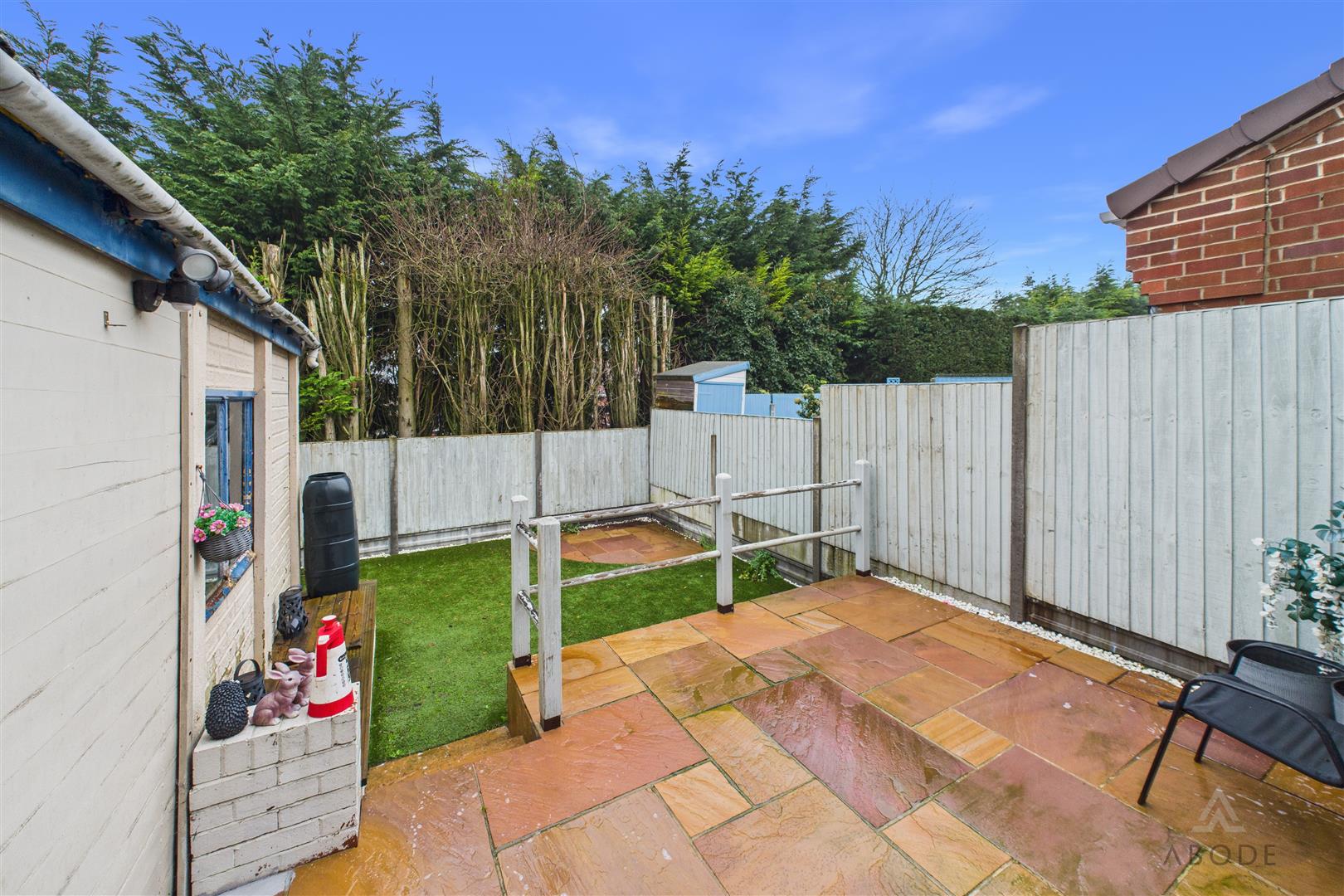 To the front, the property is set back behind a low-maintenance fore garden, with a driveway running down the side providing off-street parking and leading through to the detached garage. The rear garden is enclosed and designed with ease of maintenance in mind, featuring a raised paved patio seating area with steps down to an artificial lawn, all bounded by timber fencing and mature screening beyond—creating a pleasant, private space for outdoor seating and entertaining.