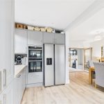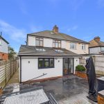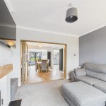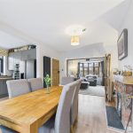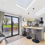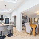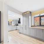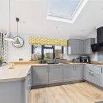 The rear extension forms the heart of the property and provides a spacious open-plan kitchen and family area, flooded with natural light via skylights and large rear-facing windows. The kitchen is fitted with a range of modern shaker-style wall and base units, complemented by generous work surfaces, integrated appliances and a breakfast bar ideal for informal dining. This impressive space enjoys excellent views over the garden and offers direct access to the rear patio, making it ideal for both everyday family life and entertaining.