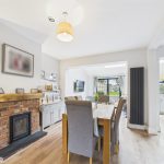 The accommodation begins with an inviting entrance hallway, featuring tiled flooring, bespoke panelling and a staircase rising to the first floor. To the front of the property is a comfortable living room, centred around a feature fireplace with a log-burning stove, creating a warm and cosy focal point. An opening leads through to the dining area, which offers ample space for a family dining table and seamlessly connects the original and extended parts of the home.