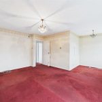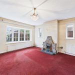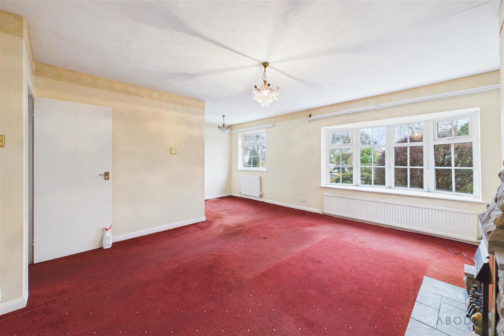To the front elevation sits a particularly spacious living room, enjoying a large bay-style window overlooking the front garden. The room features a central fireplace with stone surround and provides ample space for both seating and dining furniture, making it an ideal main reception area.