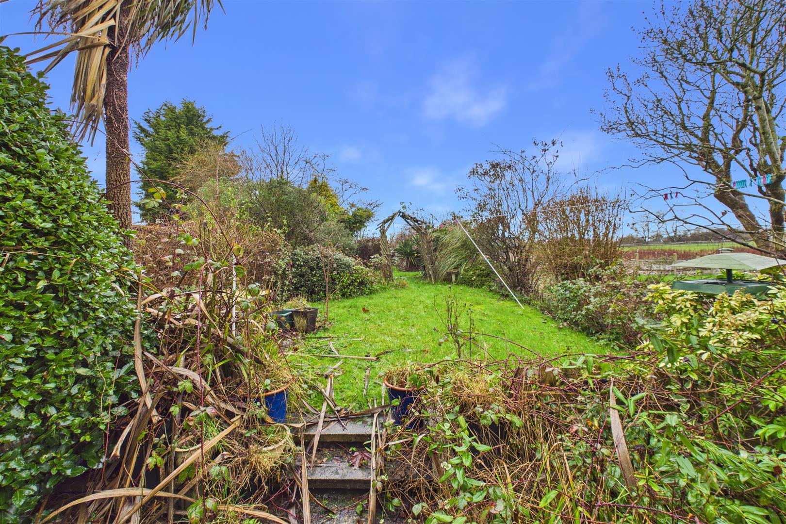 The rear garden is of a generous size and predominantly laid to lawn, bordered by mature shrubs and trees. This outdoor space offers excellent potential for landscaping and is ideal for those seeking a larger-than-average plot.