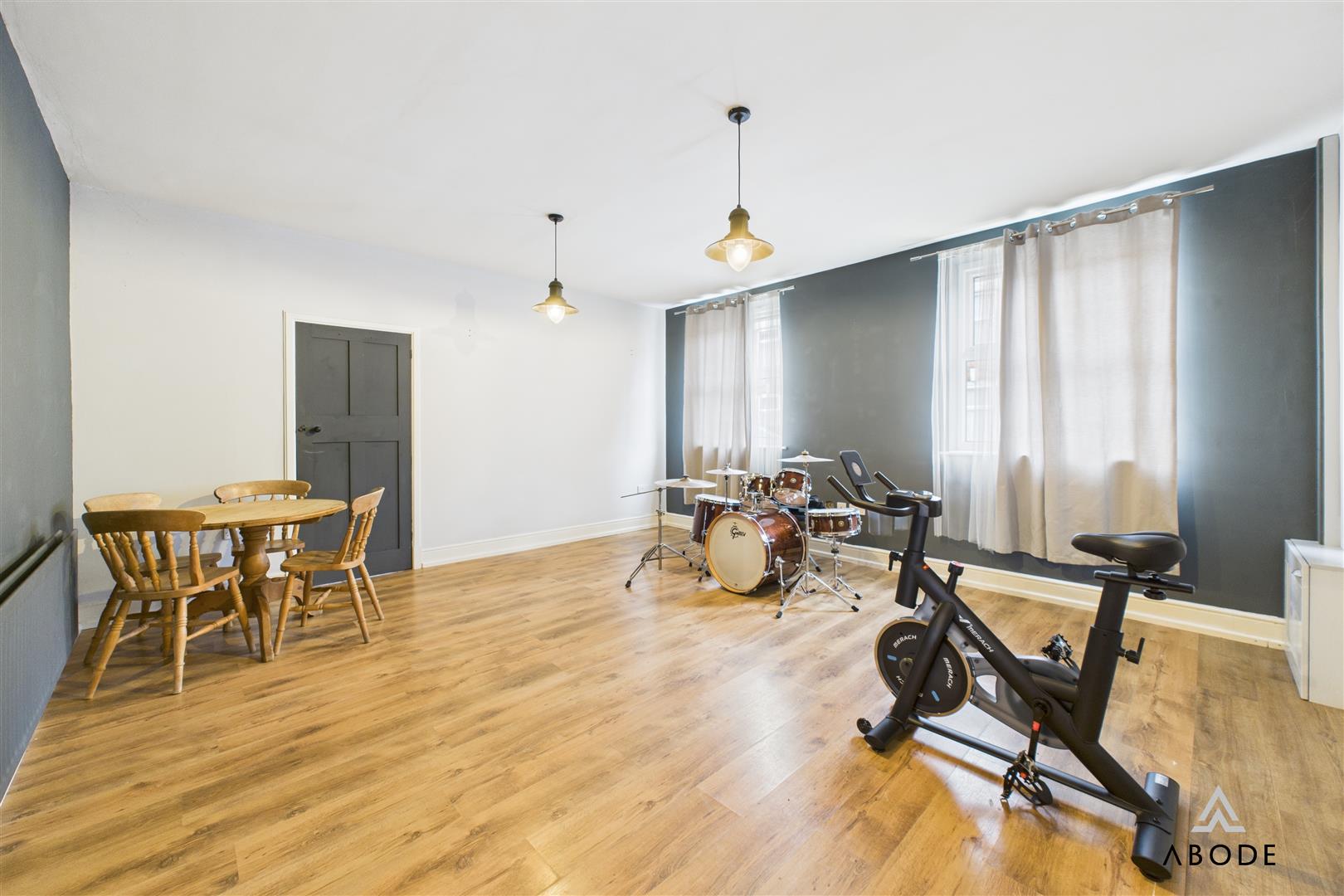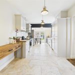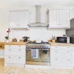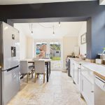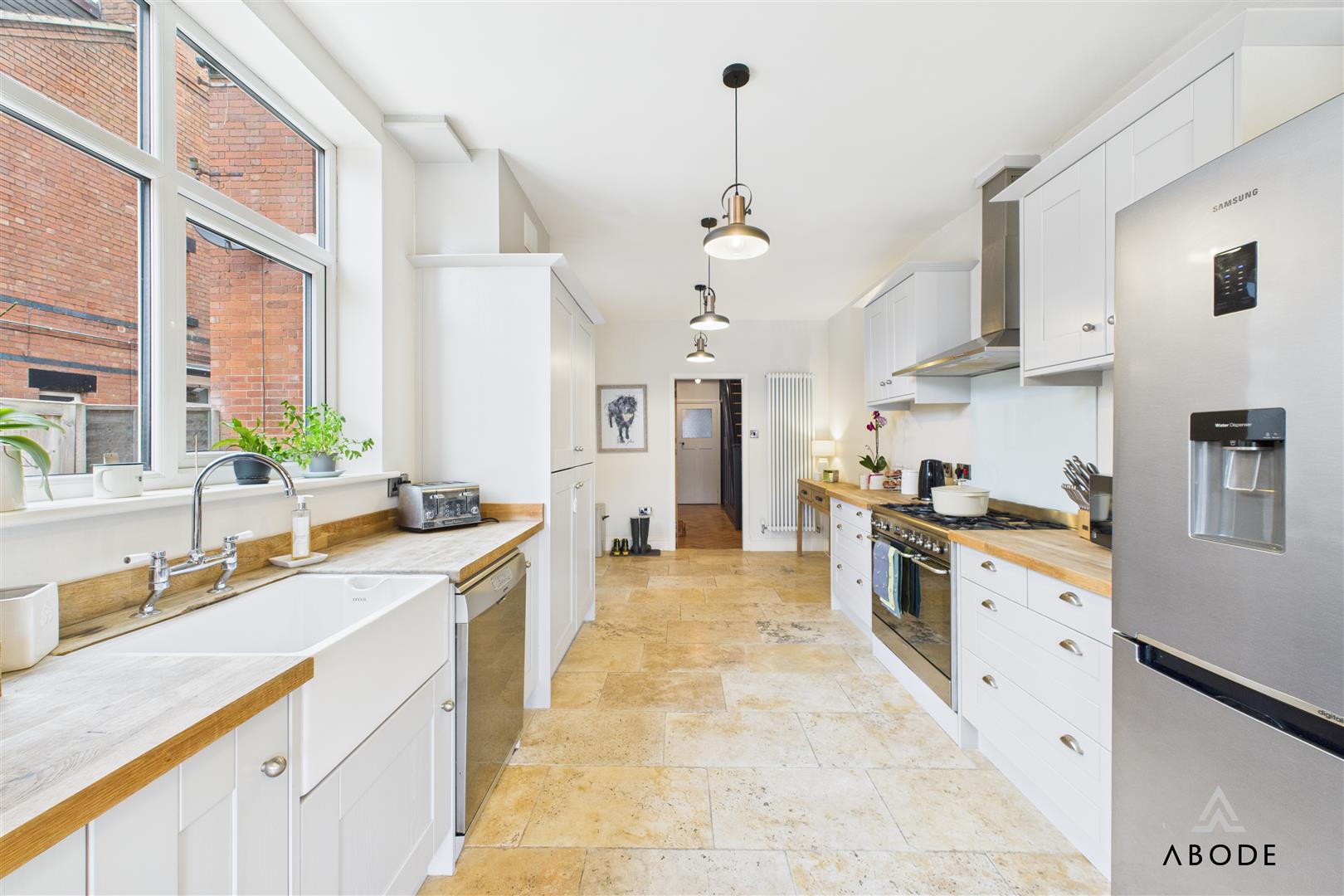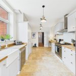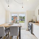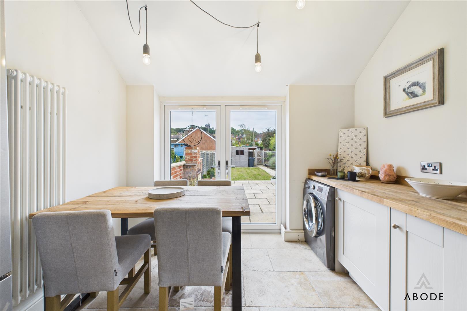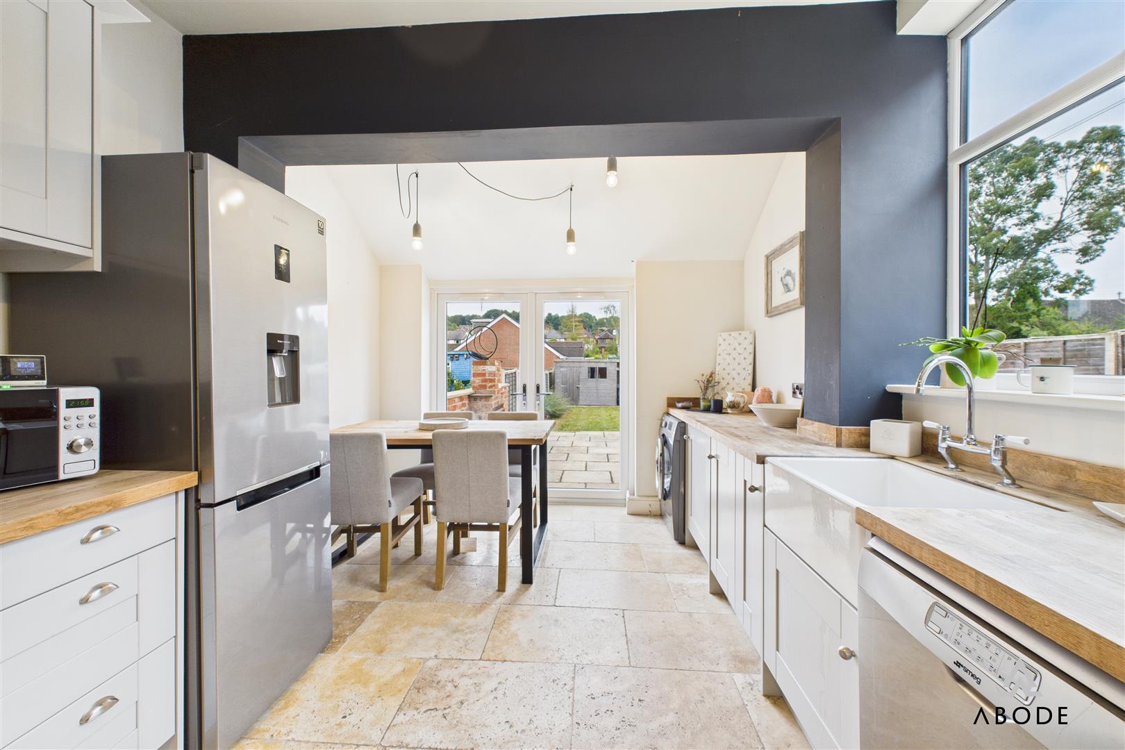 To the rear of the property, the impressive kitchen diner forms the heart of the home. Finished with shaker-style cabinets and solid wood work surfaces, the kitchen includes a space for cooker with extractor over, integrated appliances, and tiled flooring. The generous dining space beyond benefits from French doors opening directly to the patio, creating the perfect flow between indoor and outdoor living.