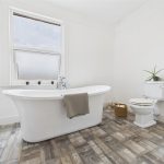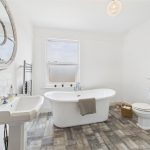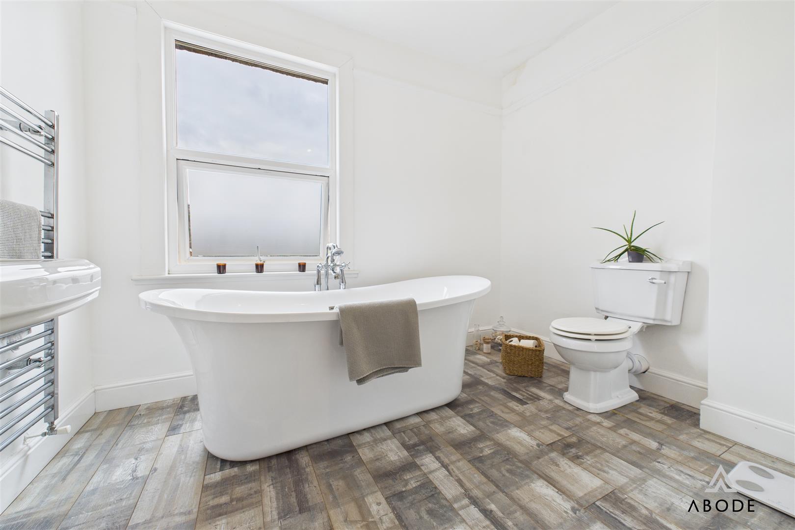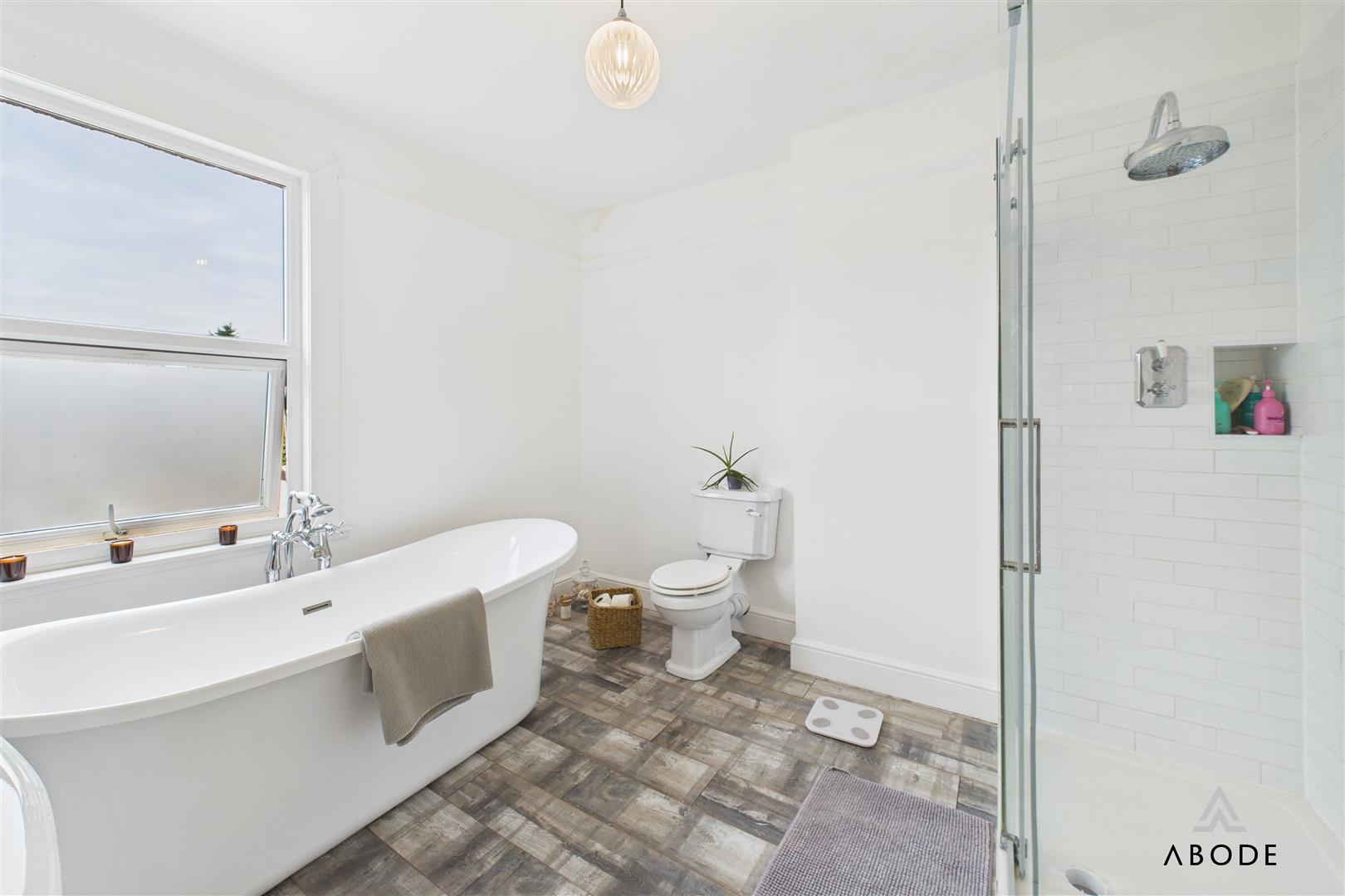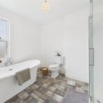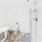 The family bathroom is finished to a high standard, comprising a freestanding roll-top bath, a separate corner shower enclosure with glass doors, a wash hand basin, and a low-level WC. Complemented by a heated towel rail and tasteful décor, the space provides a luxurious yet practical setting.