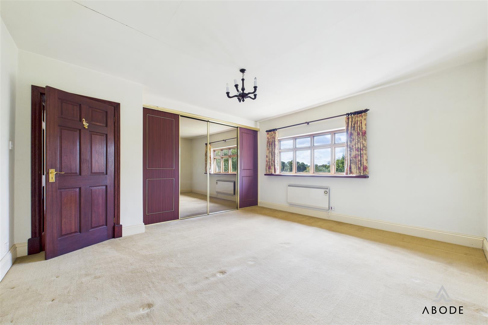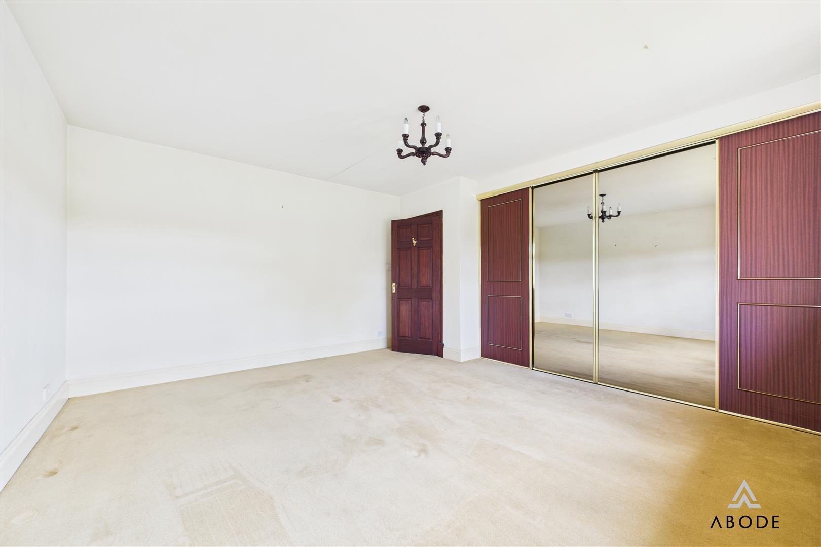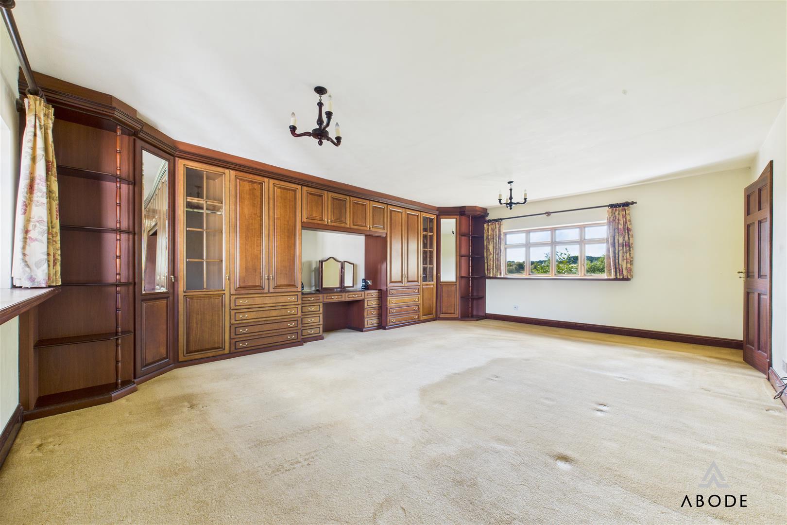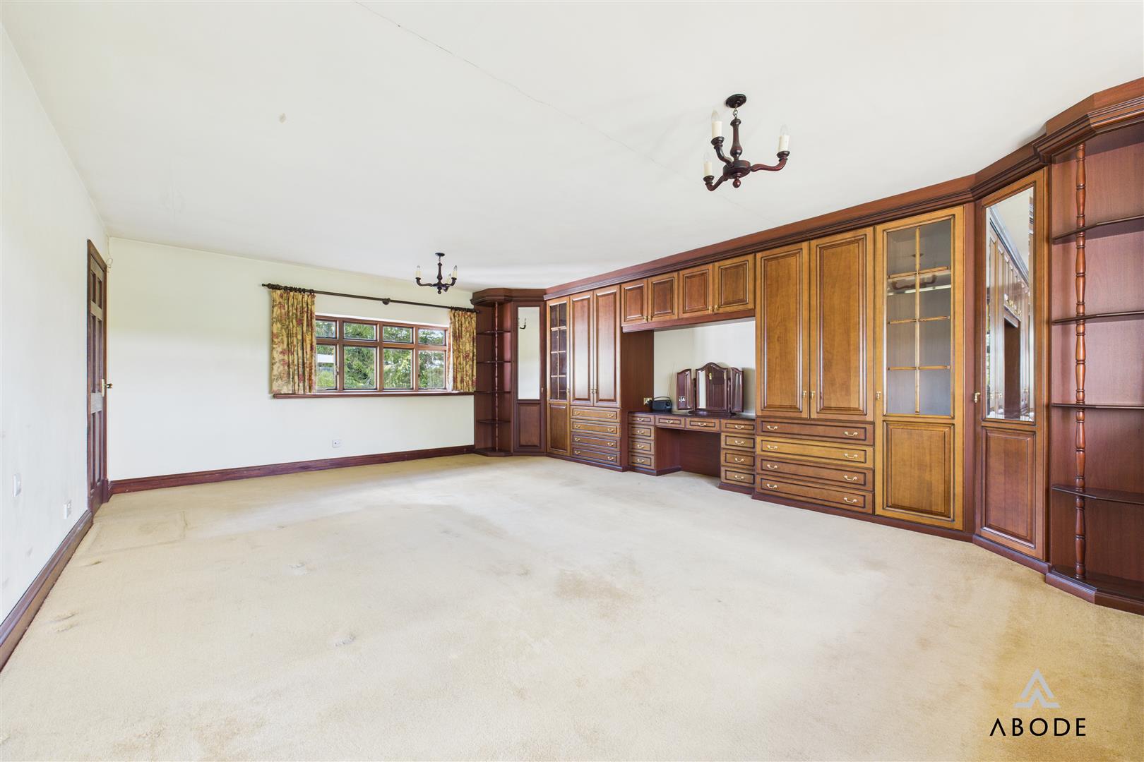 A generous double bedroom with dual aspect windows to the front and rear elevations. The room is fitted with an extensive range of built-in wardrobes, display cabinets, and a dressing table. Additional features include a TV aerial point and access to a private en suite.