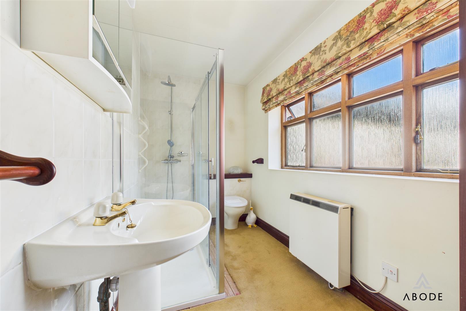 Appointed with a frosted double-glazed window to the front elevation, the en suite comprises a three-piece suite including a low-level WC, wash hand basin, and a double shower cubicle with waterfall showerhead. Complementary wall tiling, an electric storage heater, and a cupboard housing the re-fitted hot water immersion system complete the room.