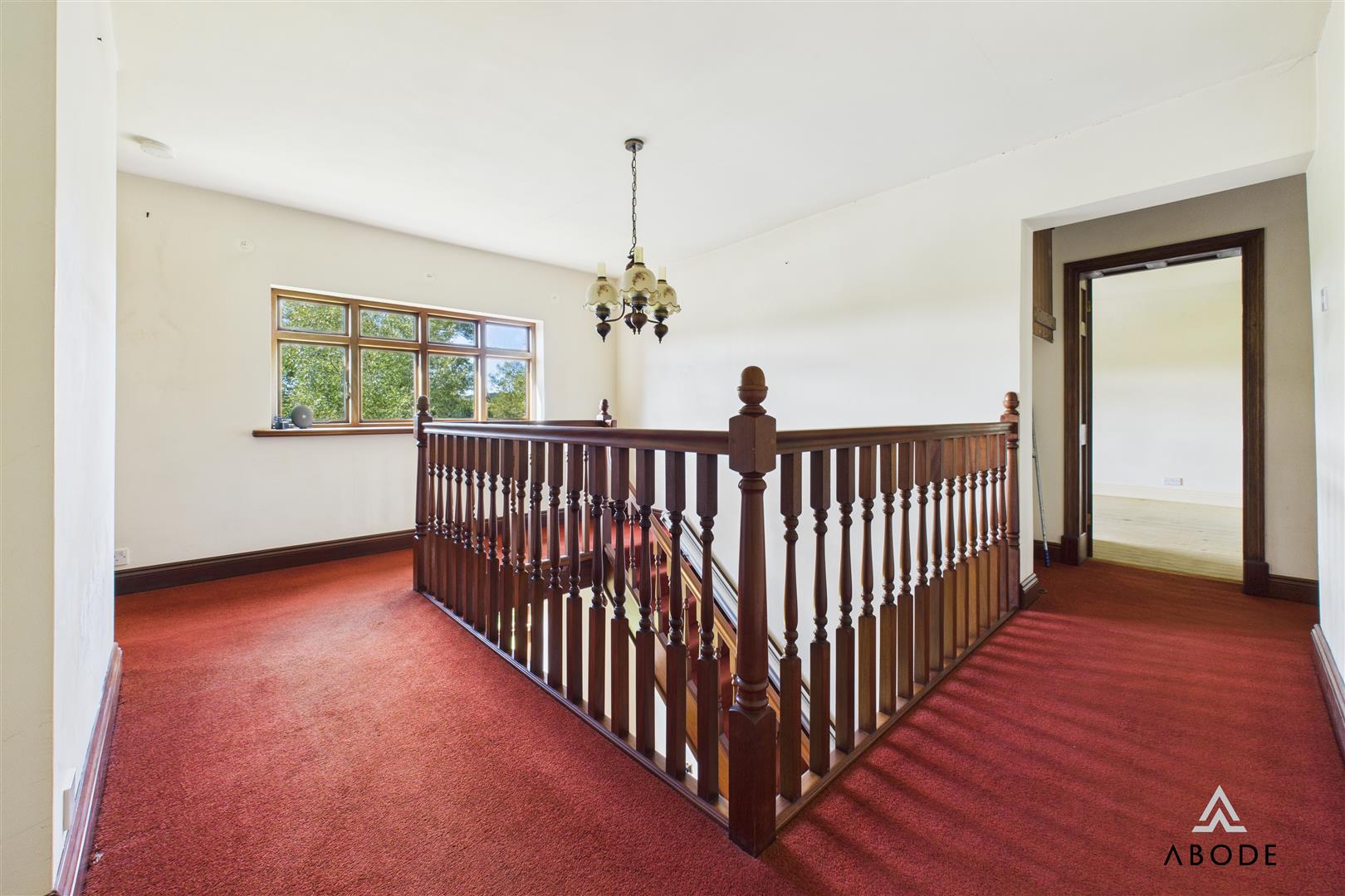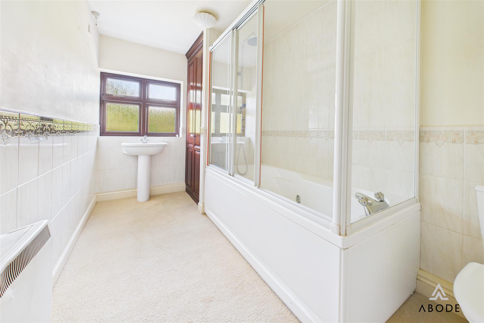 Fitted with a frosted UPVC double-glazed window to the side elevation, the family bathroom offers a three-piece suite comprising a low-level WC, wash hand basin, and Jacuzzi bath with waterfall showerhead over. The room also benefits from an airing cupboard housing a second immersion tank and an electric storage heater.