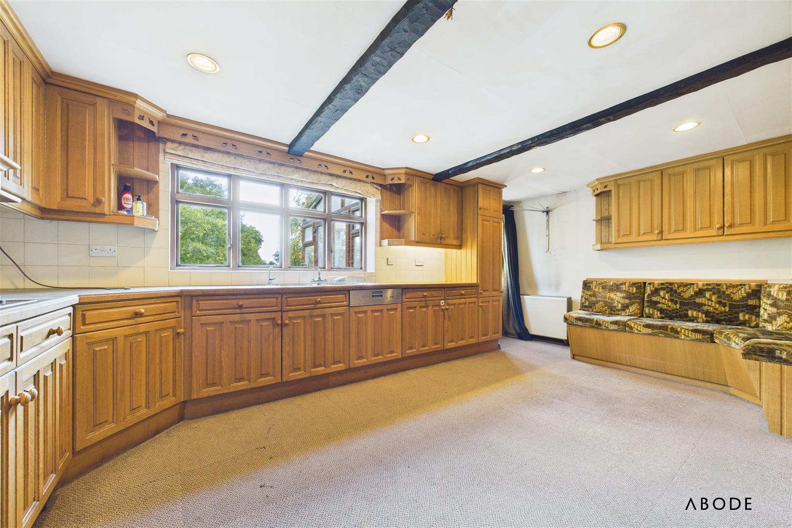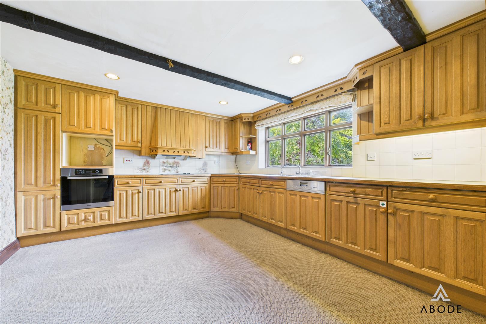 A well-appointed kitchen with a rear-facing double-glazed window, offering a comprehensive range of matching base and eye-level units, drop-edge preparation surfaces, and complementary tiling. Integrated appliances include a stainless-steel one-and-a-half sink with mixer tap, electric hob with built-in extractor, oven/grill, and dishwasher. Additional space is available for a fridge, freezer, and other freestanding white goods. Finished with ceiling spotlights, an electric storage heater, and a composite double-glazed door providing access to the second conservatory.
