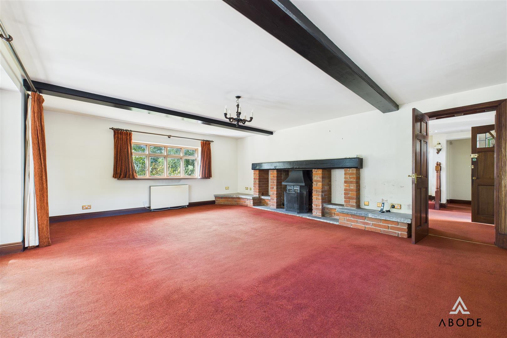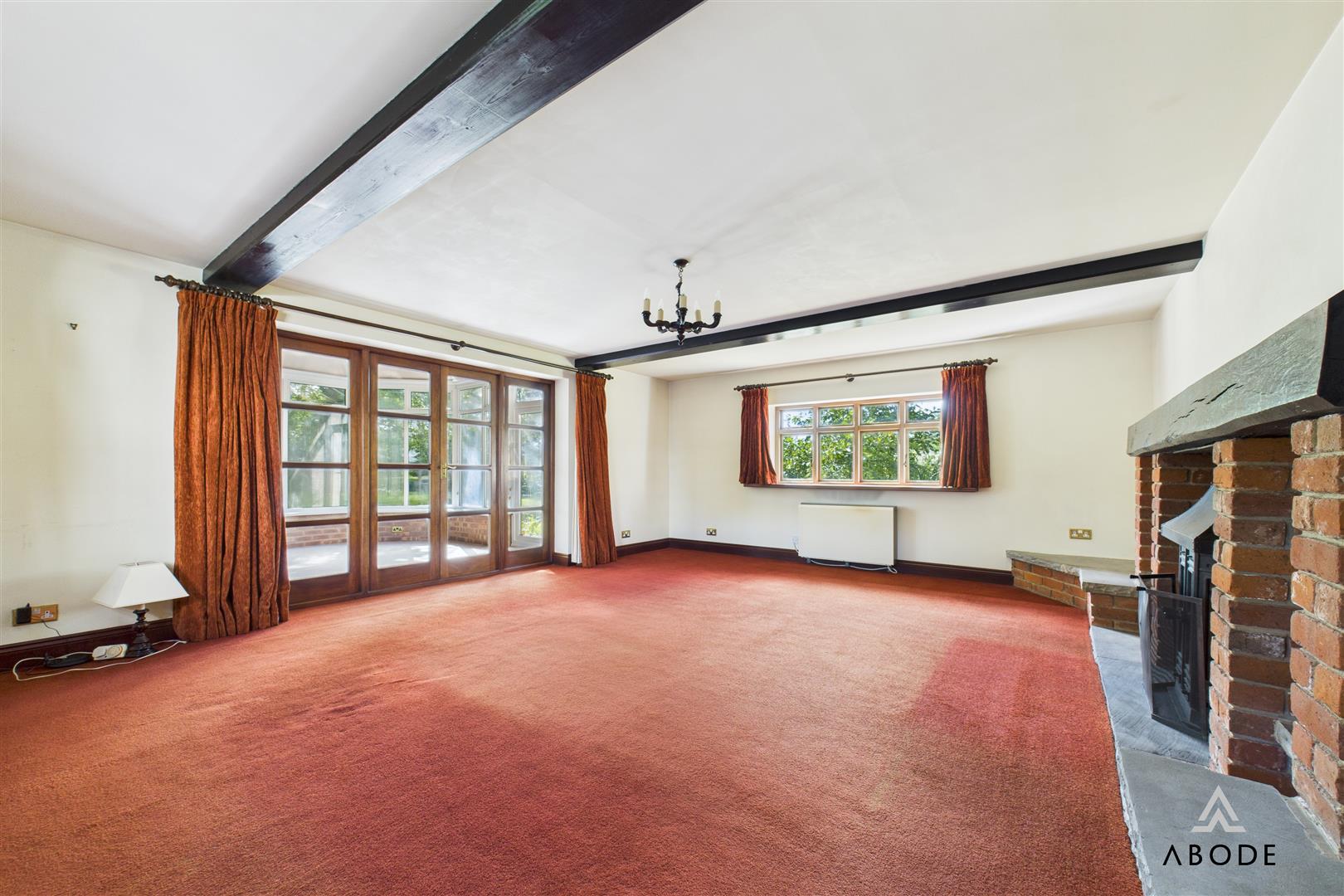 A spacious lounge with dual-aspect views to the front and rear, featuring two storage heaters and a striking cast-iron log-burning fireplace with timber mantle, exposed brick backing, and tiled hearth. Exposed beams add character, while internal double doors connect to the conservatory.