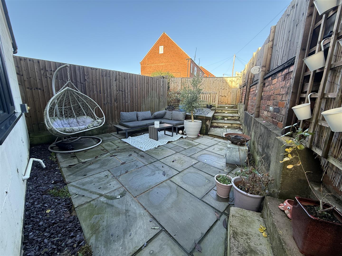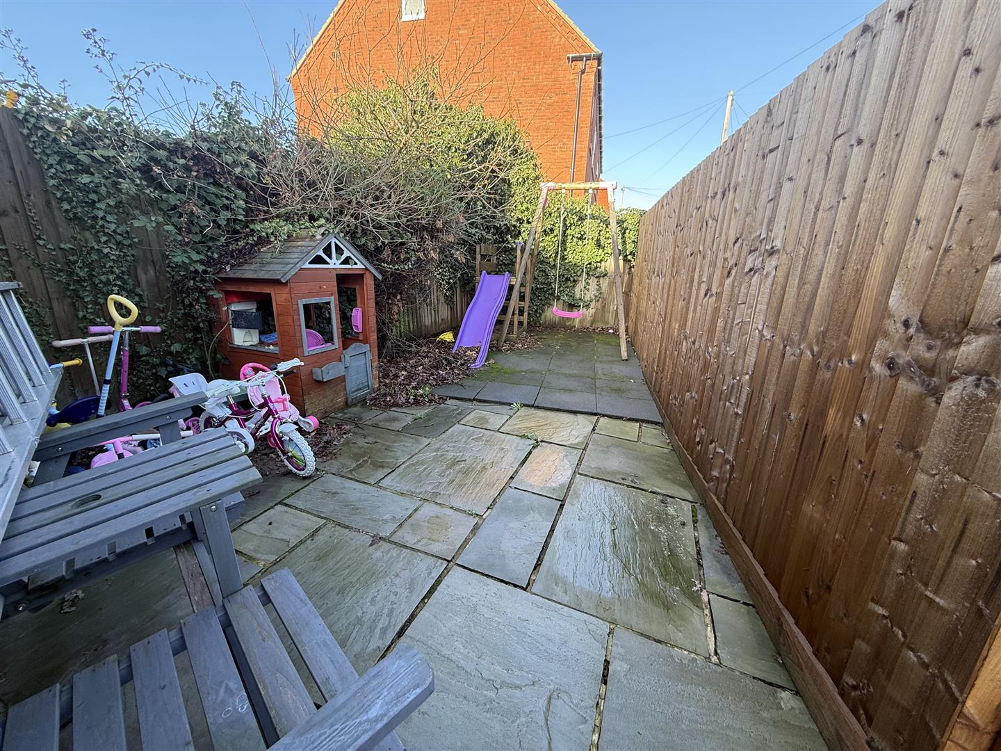 Side gated access to the enclosed rear garden offering a slate area and paved patios.