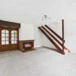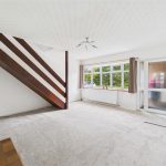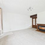 The property is entered through a porch leading into a bright and spacious living room, featuring a large double-glazed window to the front elevation, an electric fire with surround, central heating radiator, and stairs rising to the first floor.