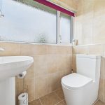 The family bathroom comprises a modern three-piece suite, including a walk-in shower cubicle, wash hand basin, and low level WC. The room is fully tiled and features a heated towel radiator and a double glazed window to the rear.