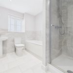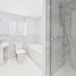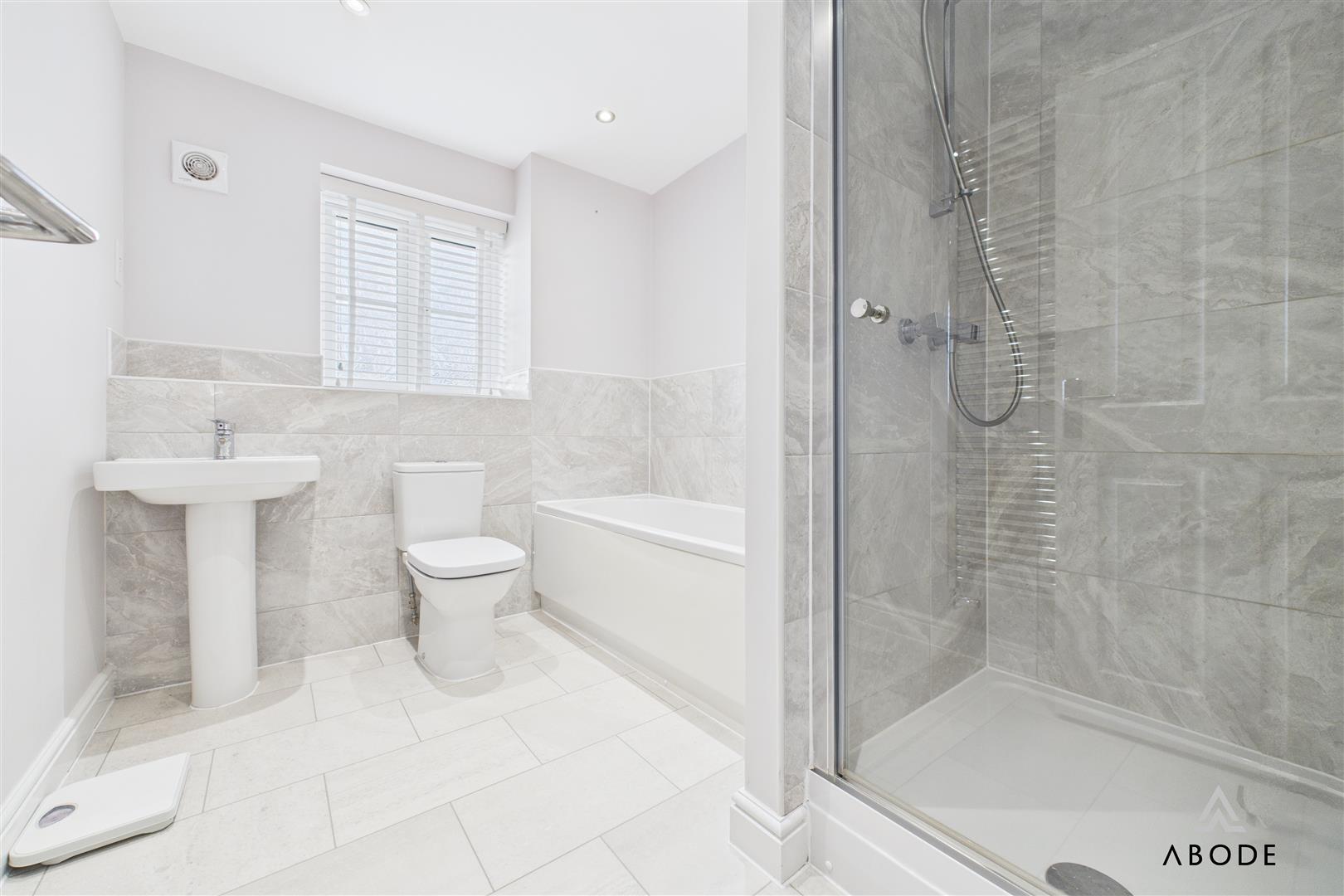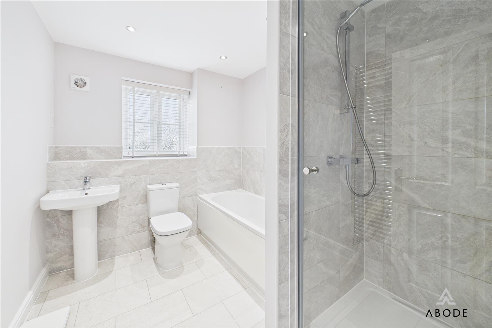 The first-floor landing provides access to two bedrooms and the family bathroom. Bedroom two is a generous double to the front elevation, while bedroom three overlooks the rear garden. The family bathroom comprises a four-piece suite including a panelled bath, separate shower cubicle, wash hand basin, and low-level WC, all complemented by tiled flooring and part-tiled walls. A further staircase leads to the second floor.