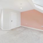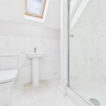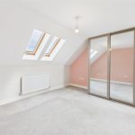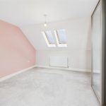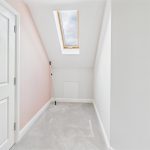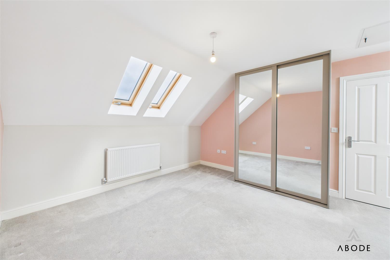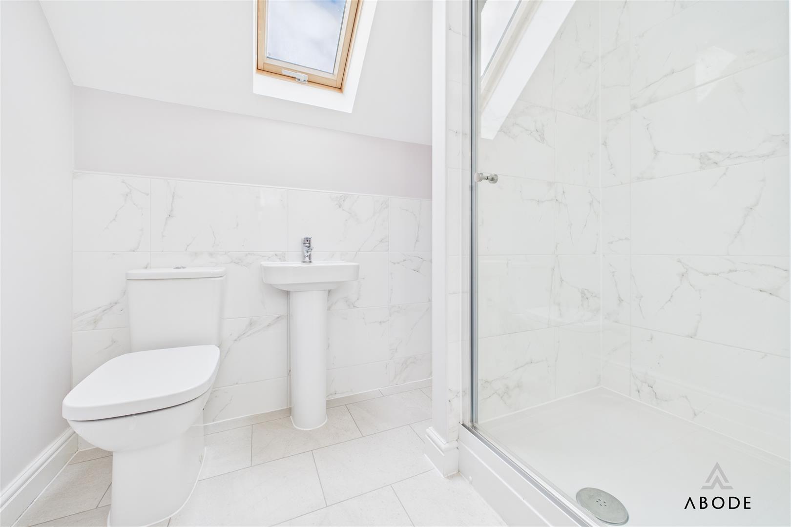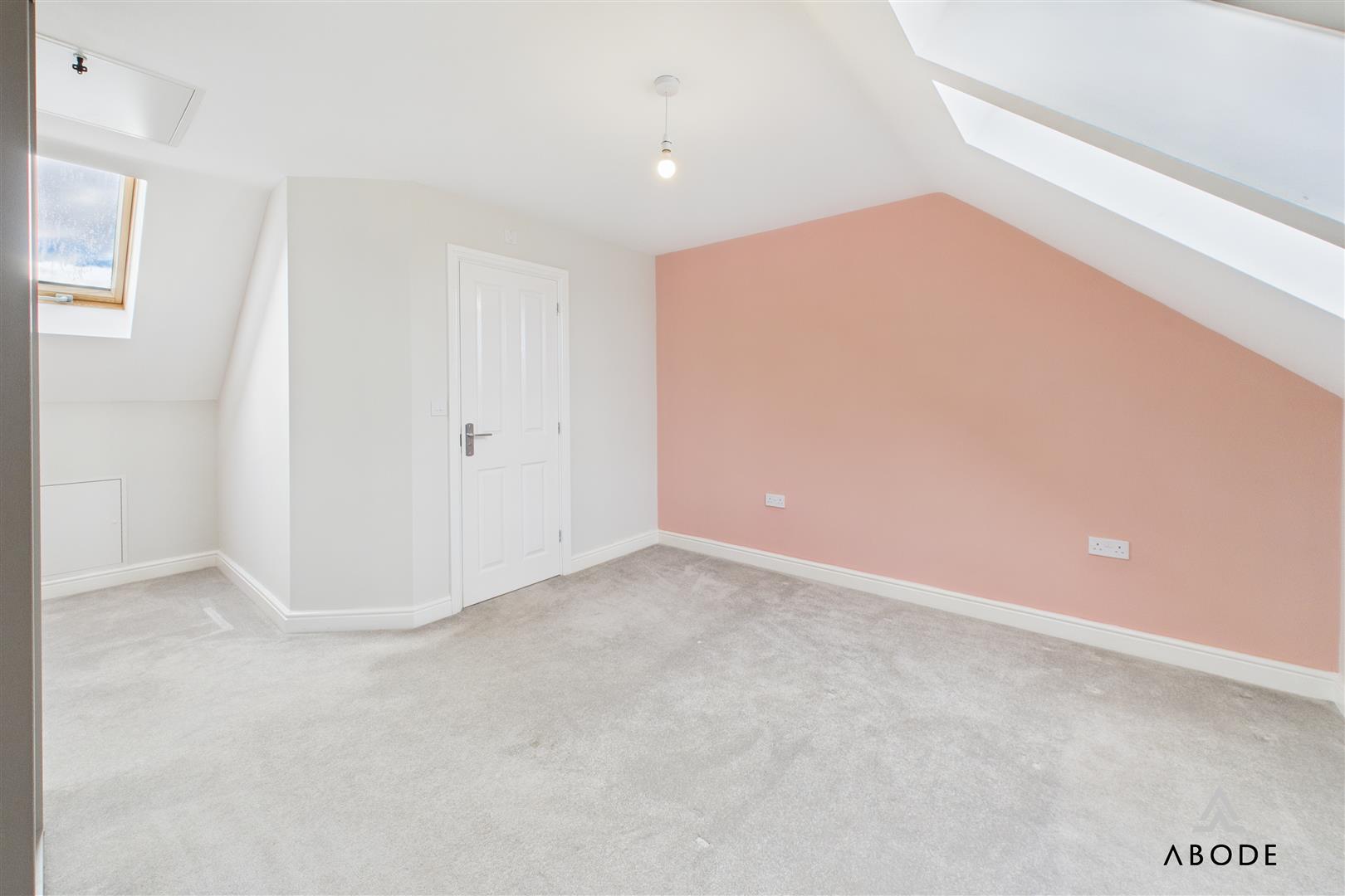 The second floor is dedicated to the master suite, offering a spacious double bedroom with two skylights allowing natural light to flood the room. There are fitted mirrored wardrobes and access to a well-appointed en-suite shower room, complete with a shower cubicle, wash hand basin, low-level WC, and heated towel rail.