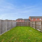 To the front elevation, there is a small landscaped fore garden with a paved pathway leading to the front door. The rear garden is mainly laid to lawn, enclosed by timber fencing, and includes a patio area ideal for outdoor seating. The property benefits from allocated off-street parking and a garage.