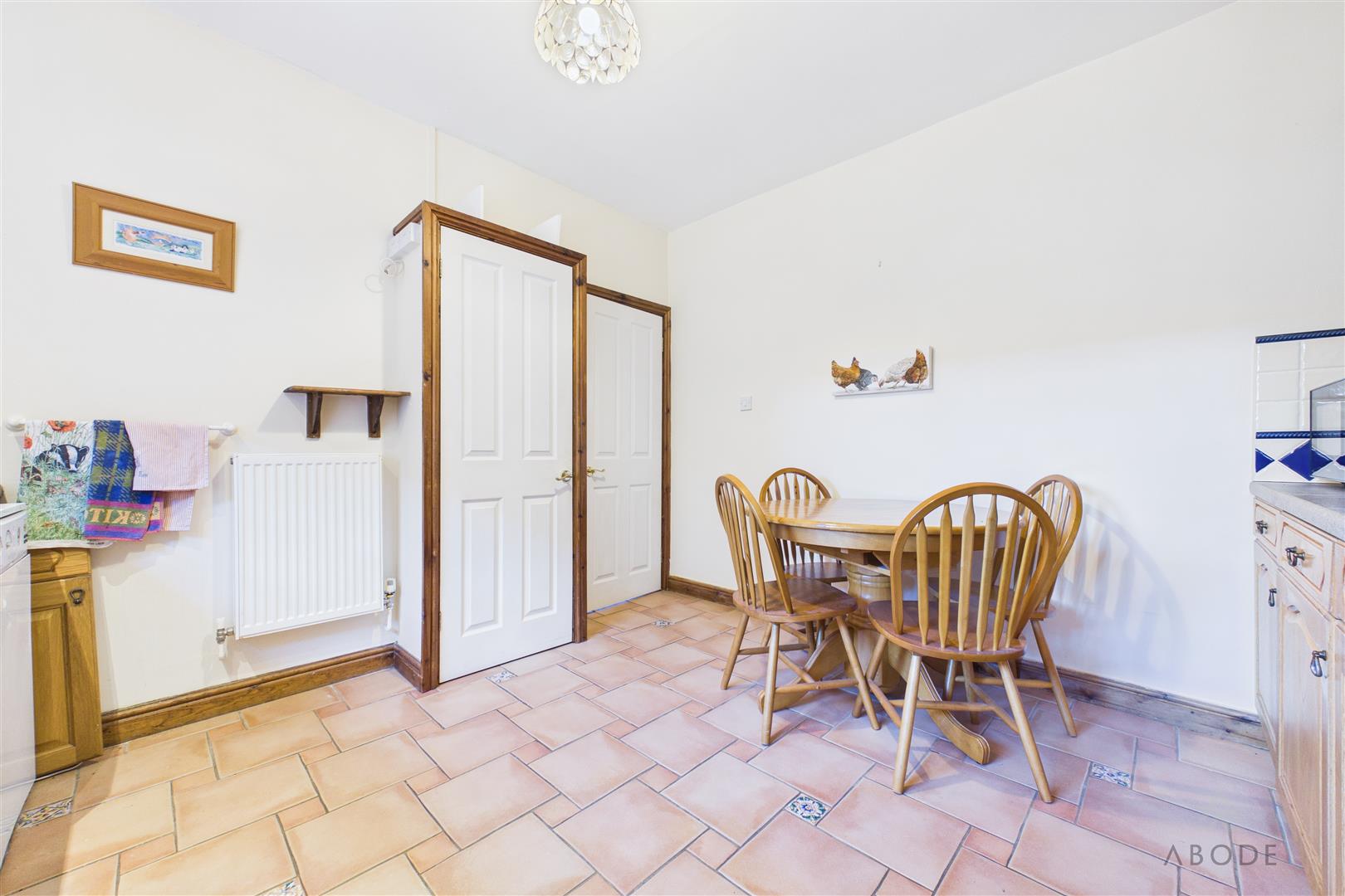 With a double-glazed window to the front elevation, the kitchen features a range of matching base and eye-level storage cupboards and drawers with granite-effect drop-edge preparation surfaces and complementary tiling to walls and flooring. Integrated appliances include a one-and-a-half ceramic sink with mixer tap, oven, four-ring electric hob with extractor, dishwasher, washing machine, and the oil-fired central heating boiler. The room also includes a central heating radiator, useful utilities cupboard, and ceiling spotlighting.