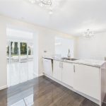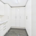 The kitchen is fitted with sleek high-gloss cabinetry, integrated appliances including a double oven and gas hob, a stainless steel extractor, dishwasher, fridge, and freezer, along with a one-and-a-half bowl sink and complementary work surfaces. A large built-in pantry provides excellent additional storage, and the Italian tiled flooring enhances the premium feel of the space.