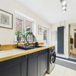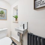 The cloakroom is fitted with a UPVC double-glazed frosted window to the rear elevation and comprises a low-level WC with continental flush, floating wash hand basin with mixer tap and tiled splashback, and a central heating radiator. The room also houses the central heating combination gas boiler.