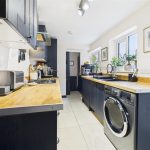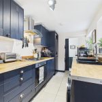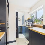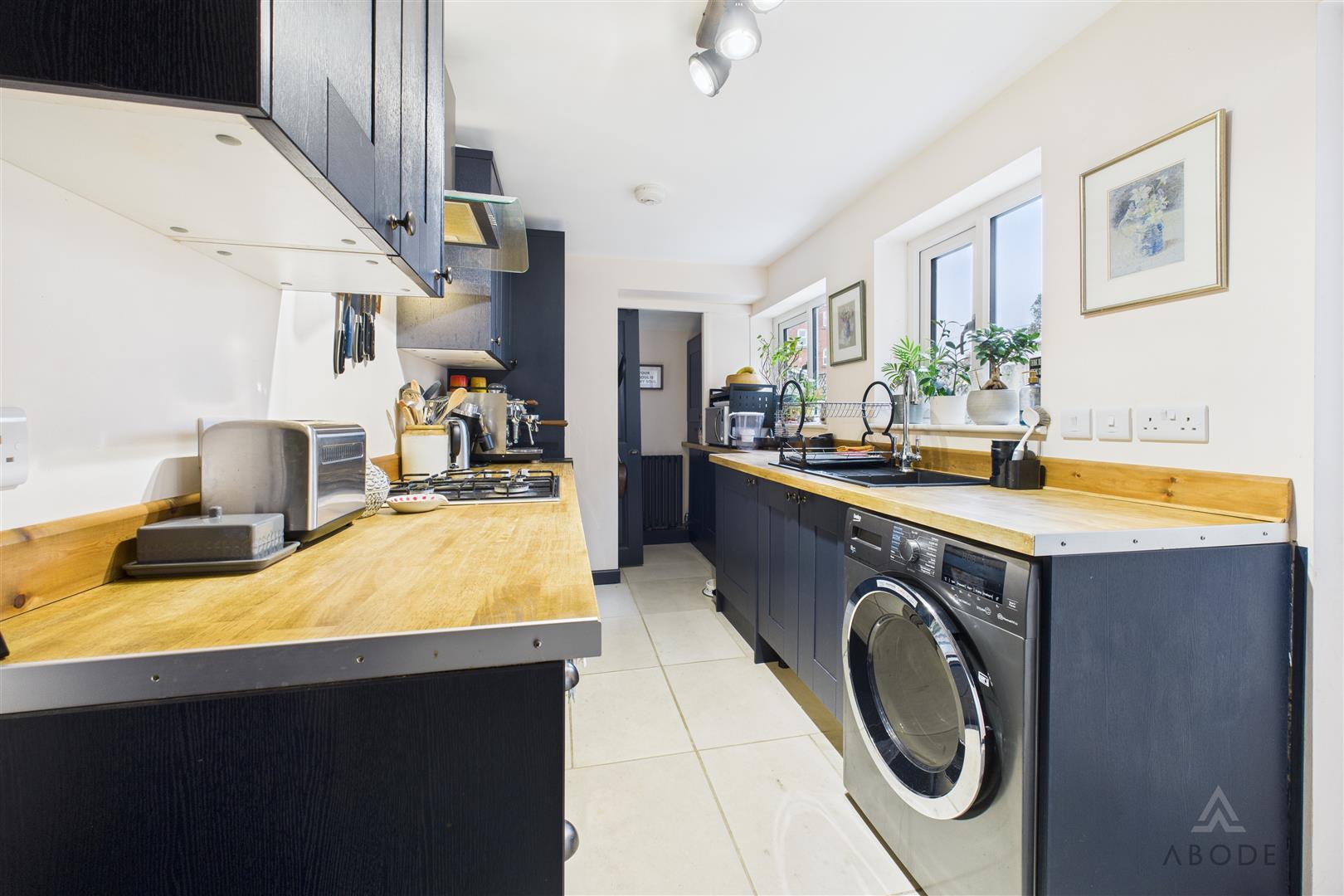 The kitchen benefits from two UPVC double-glazed windows to the side elevation and is fitted with a range of matching base and eye-level storage cupboards and drawers, complemented by wood-block drop-edge preparation work surfaces. Integrated appliances include a four-ring stainless steel gas hob with matching extractor hood, oven and grill, along with a composite sink and drainer with mixer tap. There is plumbing and space for freestanding and under-counter white goods, a central heating radiator, smoke alarm, and a UPVC double-glazed door providing direct access to the rear garden. An internal sliding door leads to the cloakroom WC.