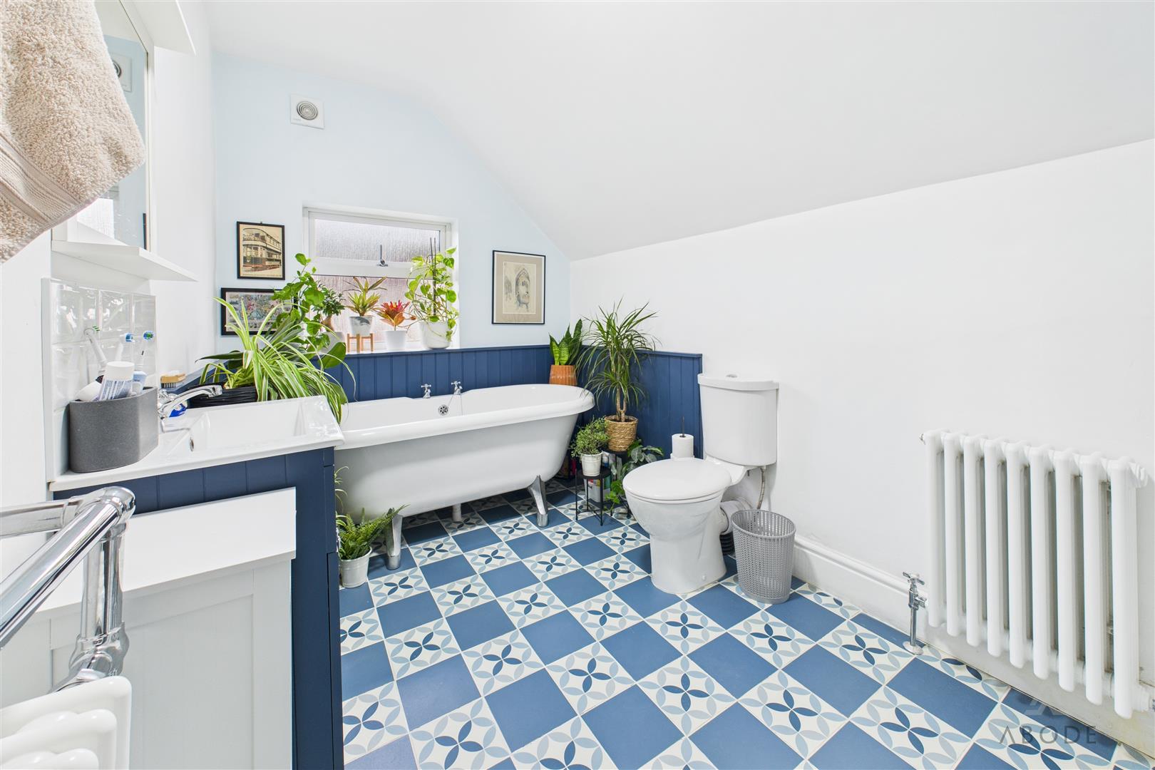 The family bathroom features a UPVC double-glazed frosted window to the rear elevation and is fitted with an impressive four-piece suite comprising a low-level WC, freestanding roll-top bath, vanity wash hand basin with chrome mixer tap and tiled splashback, and a double walk-in shower cubicle with waterfall showerhead. Complementary tiling is provided to both floor and wall coverings, with additional features including central heating radiators and an extractor fan.
