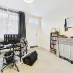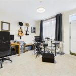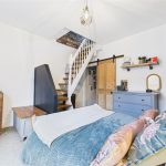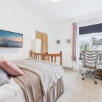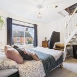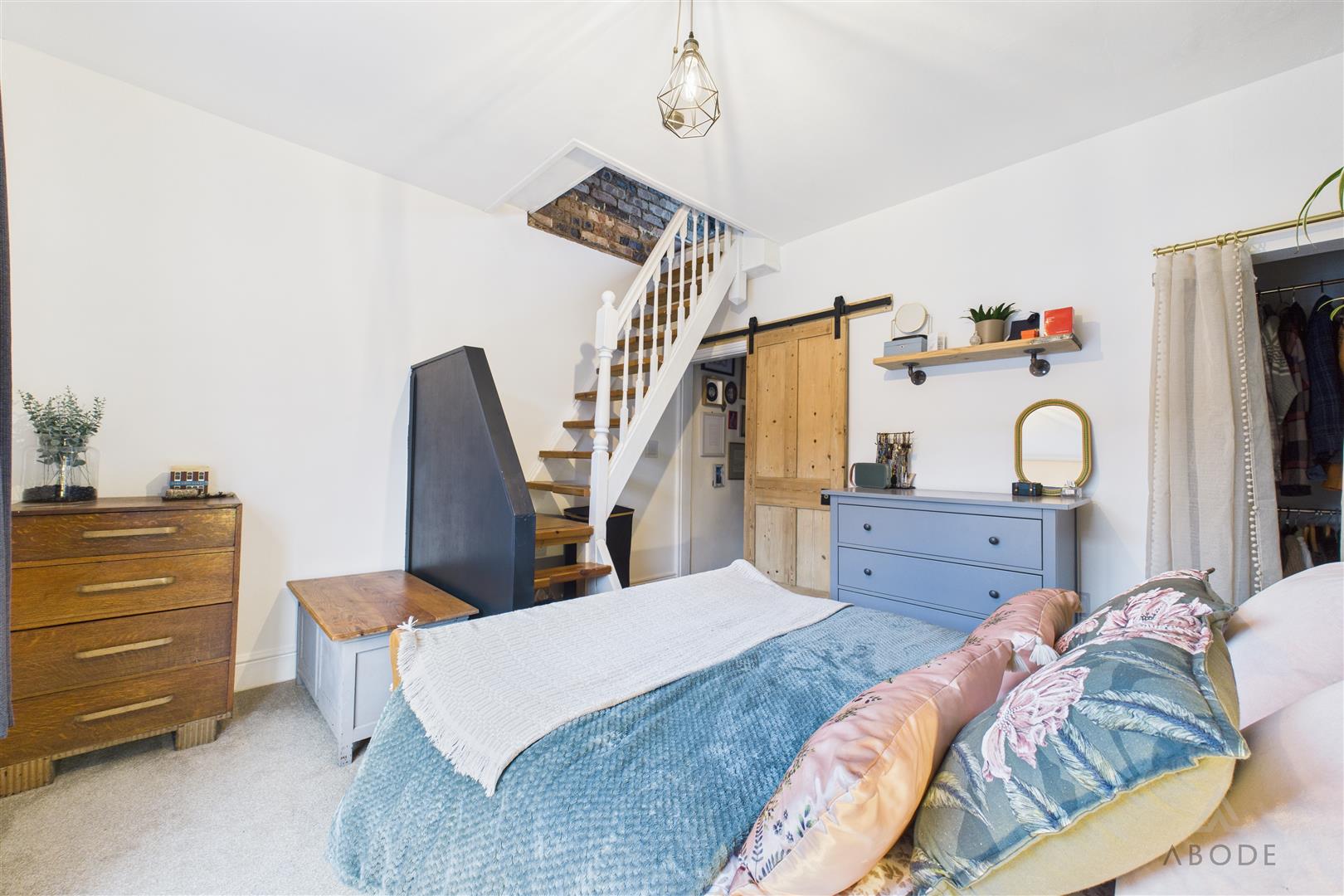 The principal bedroom benefits from a UPVC double-glazed window to the front elevation and a central heating radiator. A useful built-in over-stairs wardrobe provides hanging space, and a staircase rises from the room to the attic space.