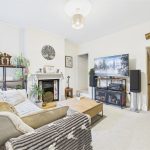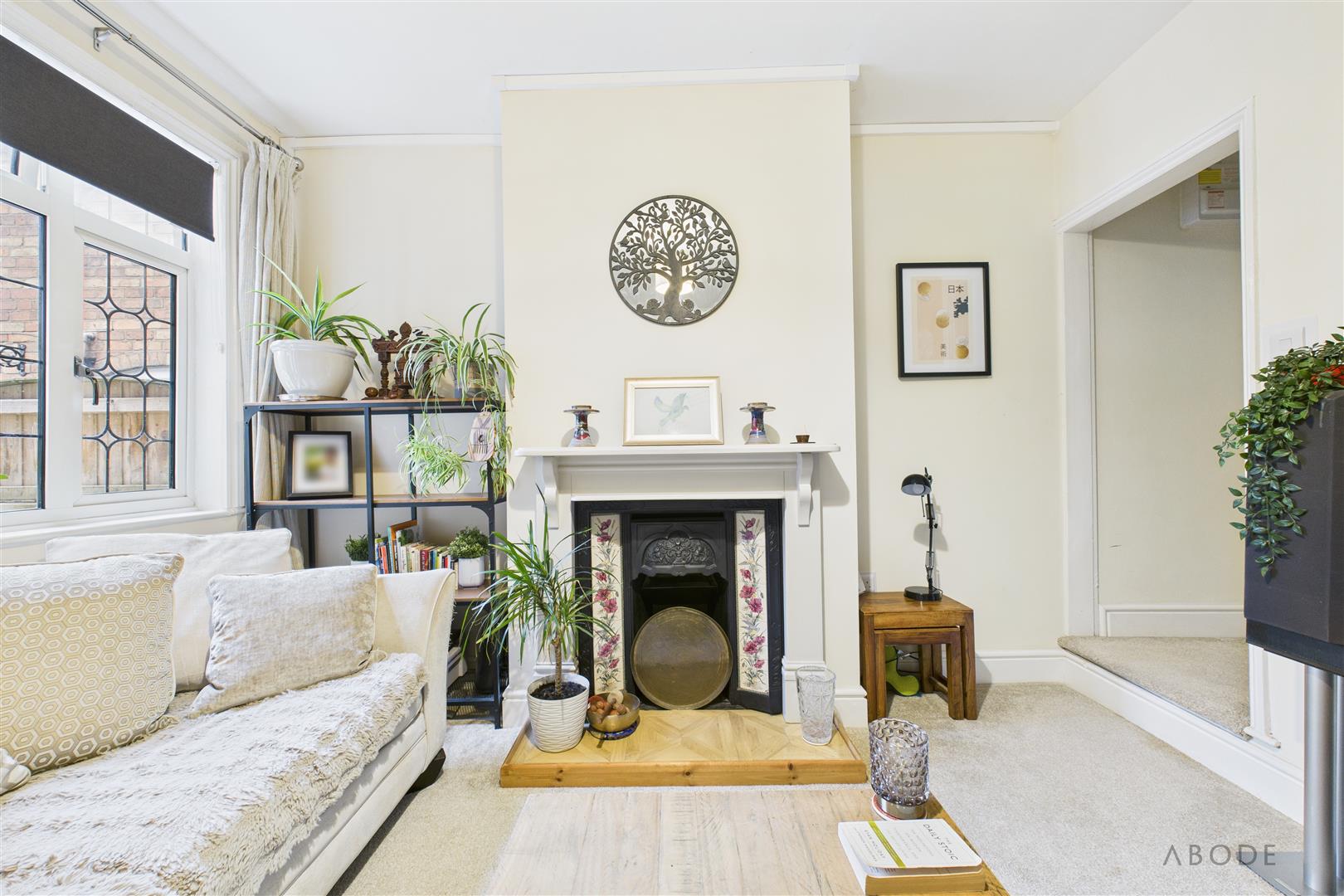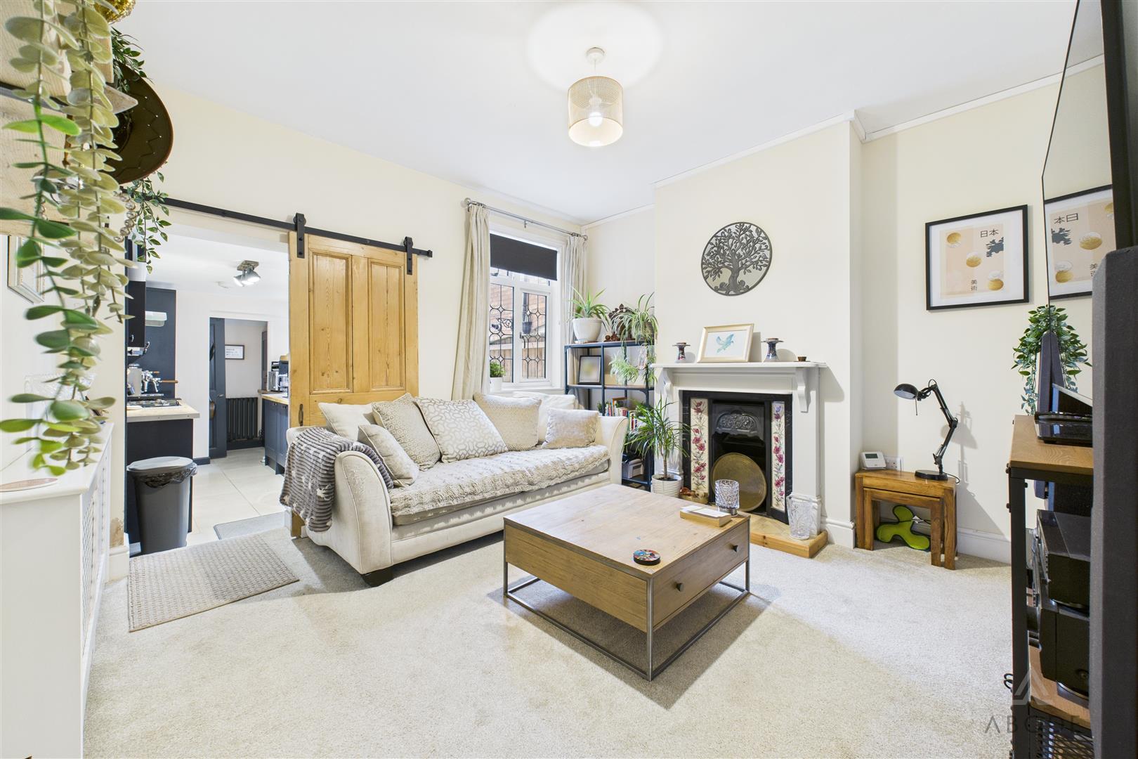 Positioned to the rear of the property, the lounge enjoys a UPVC double-glazed window overlooking the garden and features a central heating radiator. A bespoke focal fireplace with a timber Adam-style surround adds character to the room. The staircase rises to the first-floor landing and houses the electrical consumer unit, with a useful under-stairs storage cupboard. An internal sliding door provides access to the kitchen.