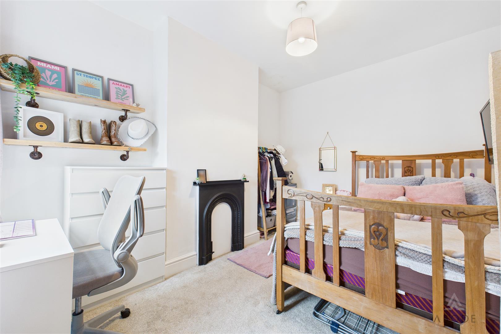 A second double bedroom with a UPVC double-glazed window to the rear elevation, central heating radiator, and a feature fireplace.