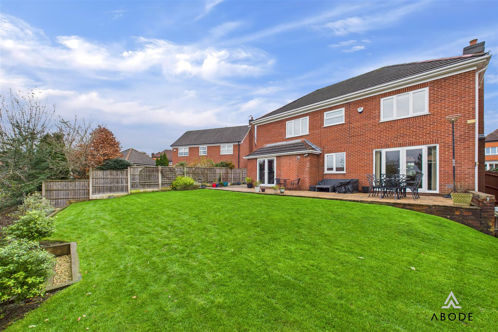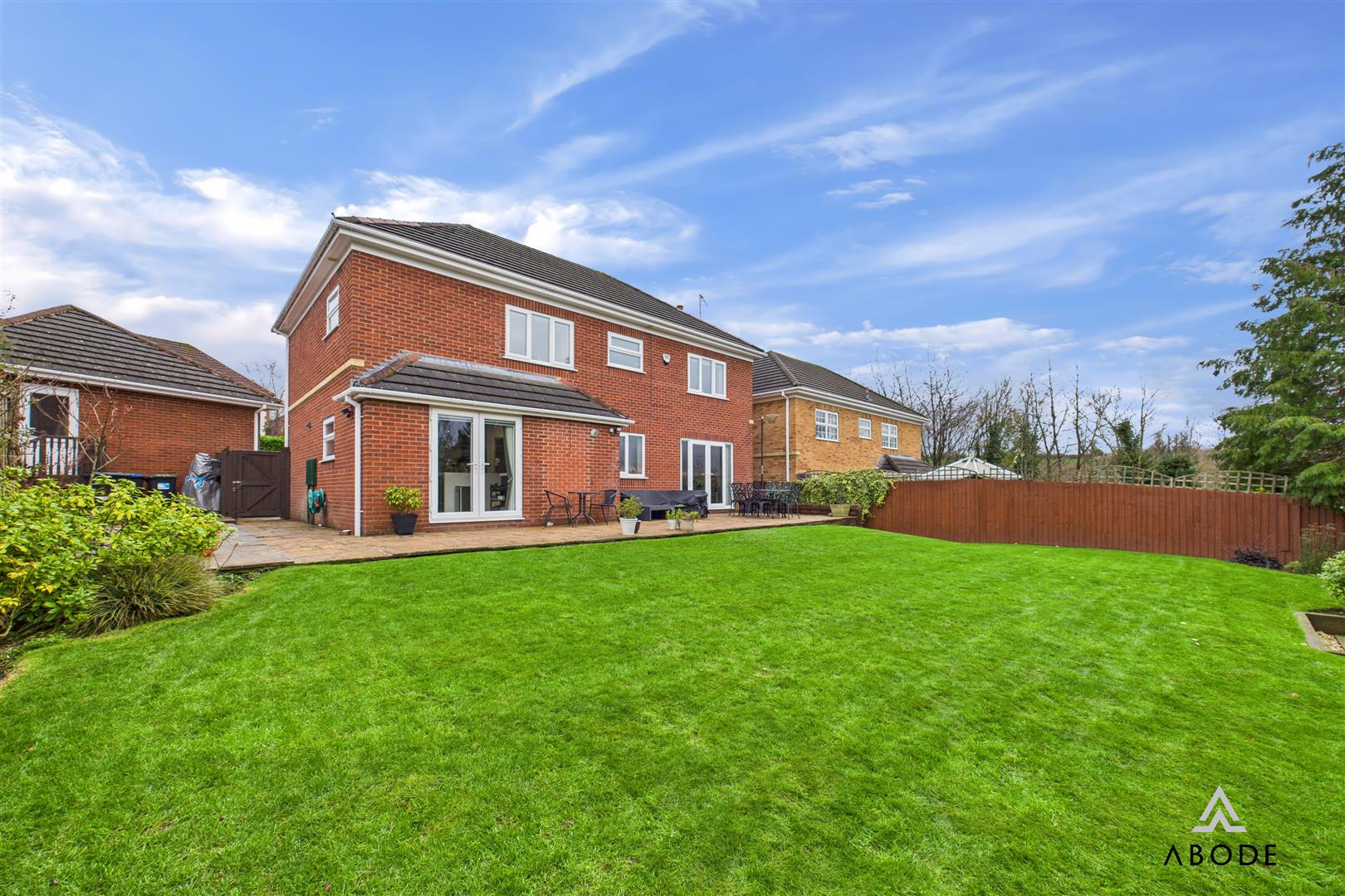 A detached double garage with an electric up-and-over door to the front. The interior has been plastered and decorated and benefits from power points, lighting, a concrete floor and a pull-down loft hatch with ladder for additional storage. A rear entry door provides convenient access to decking and steps leading to the side patio.